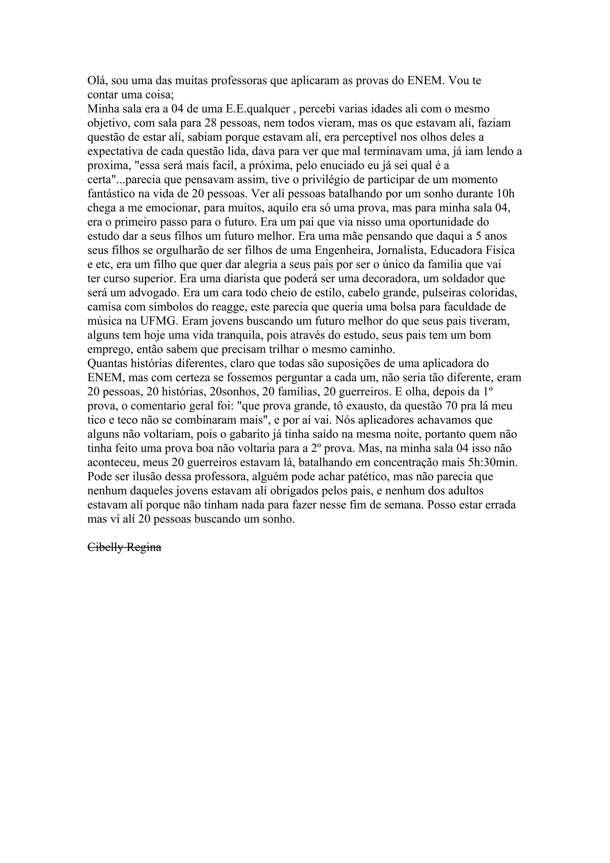 A professora descreve sua experiência aplicando o ENEM em uma sala com 20 candidatos de diferentes idades e origens socioeconômicas. Ela observou a determinação deles em fazer bem a prova, visando um futuro melhor através da educação. Apesar da dificuldade da primeira prova, todos retornaram no segundo dia, mostrando sua força de vontade em lutar por seus sonhos.