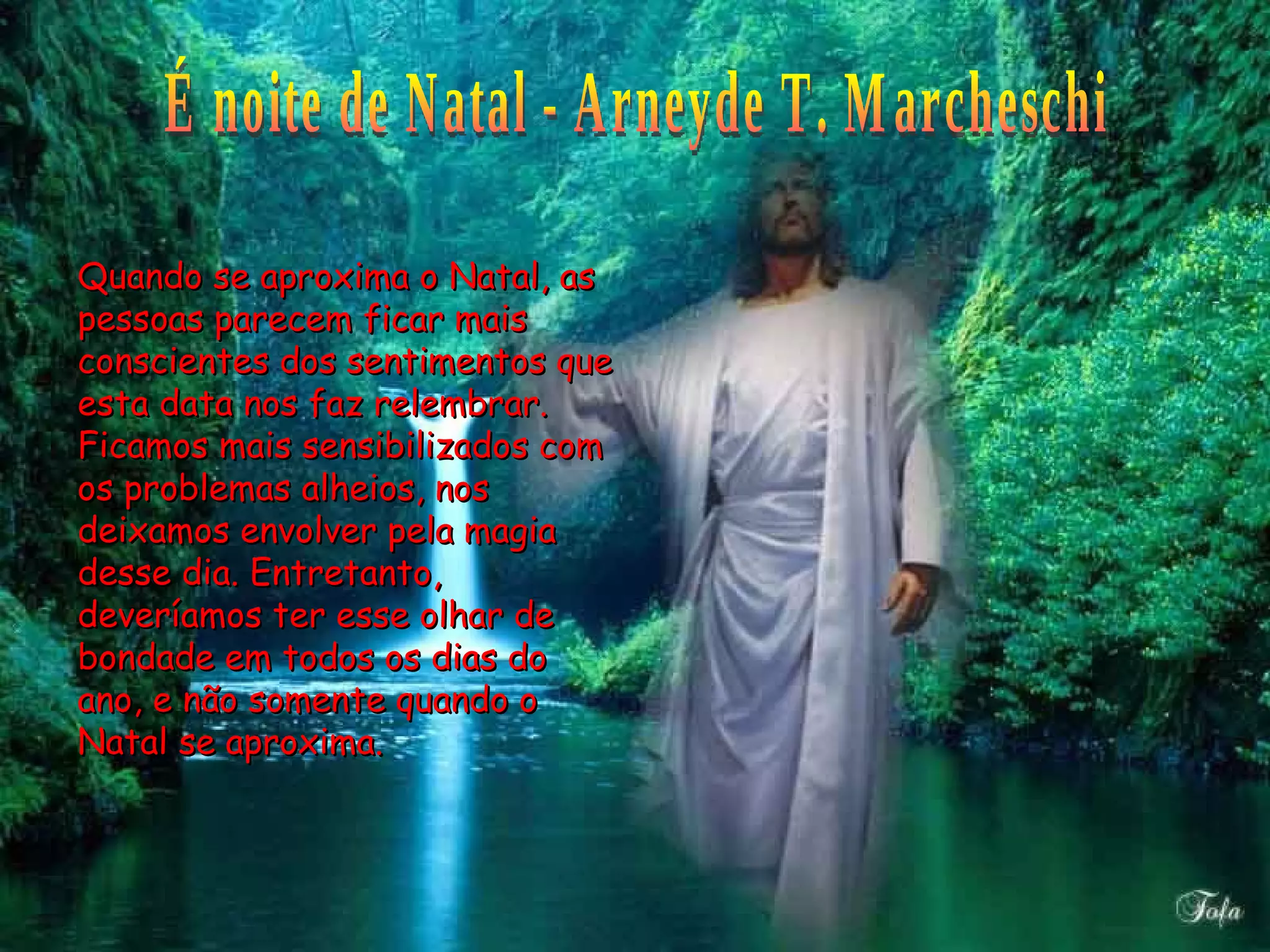 O texto fala sobre os sentimentos de bondade, compaixão e perdão que o Natal desperta nas pessoas e propõe que essas qualidades sejam cultivadas durante todo o ano. Deseja que as pessoas sintam alegria, esperança, amor e perdão nos encontros com os outros e que se deixem guiar pela luz, paz e solidariedade cristã. Finaliza desejando um Natal iluminado e um Ano Novo com saúde, harmonia e amor para todos.