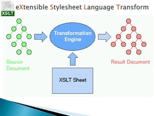 O documento discute XML (Extensible Markup Language), comparando-o com HTML e descrevendo suas características, aplicações e como inseri-lo em documentos HTML. Explica também XSLT (Extensible Stylesheet Language Transformations) e como formatar documentos XML.
