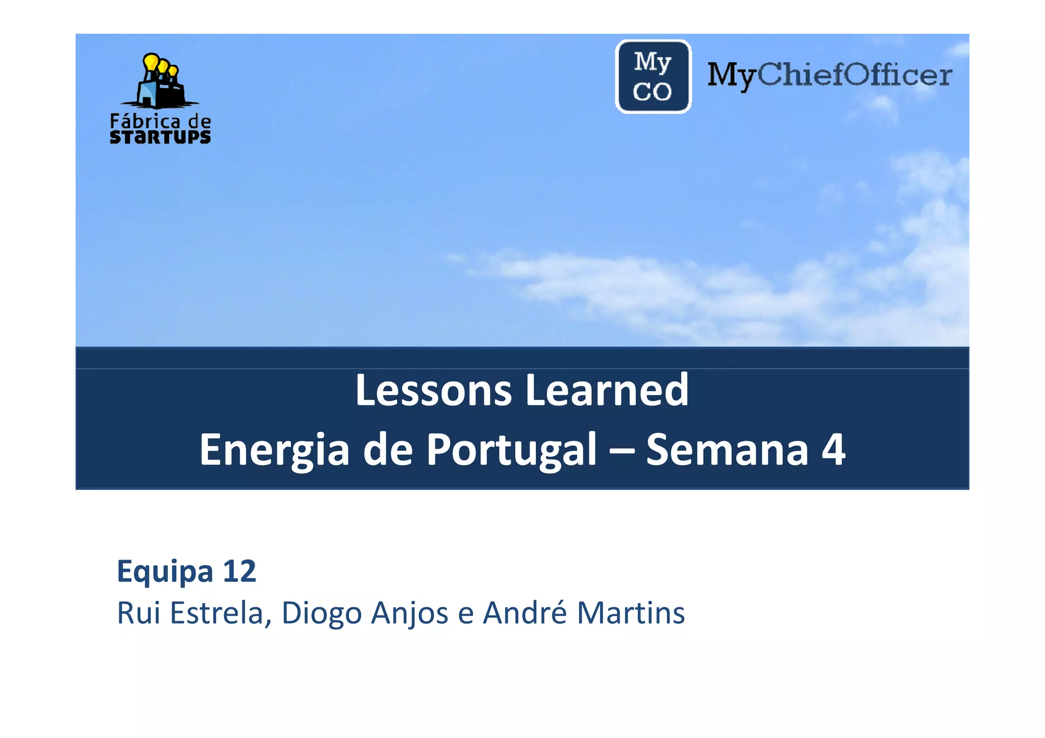O documento discute as lições aprendidas da quarta semana do programa de aceleração. As principais lições incluem: 1) Os parceiros estão dispostos a ajudar, mas é difícil obter respostas aos questionários sem alguém para ligar; 2) Foram feitas mais versões da página inicial para melhorar a proposta; 3) É necessário acelerar o trabalho, pois o tempo está a acabar.