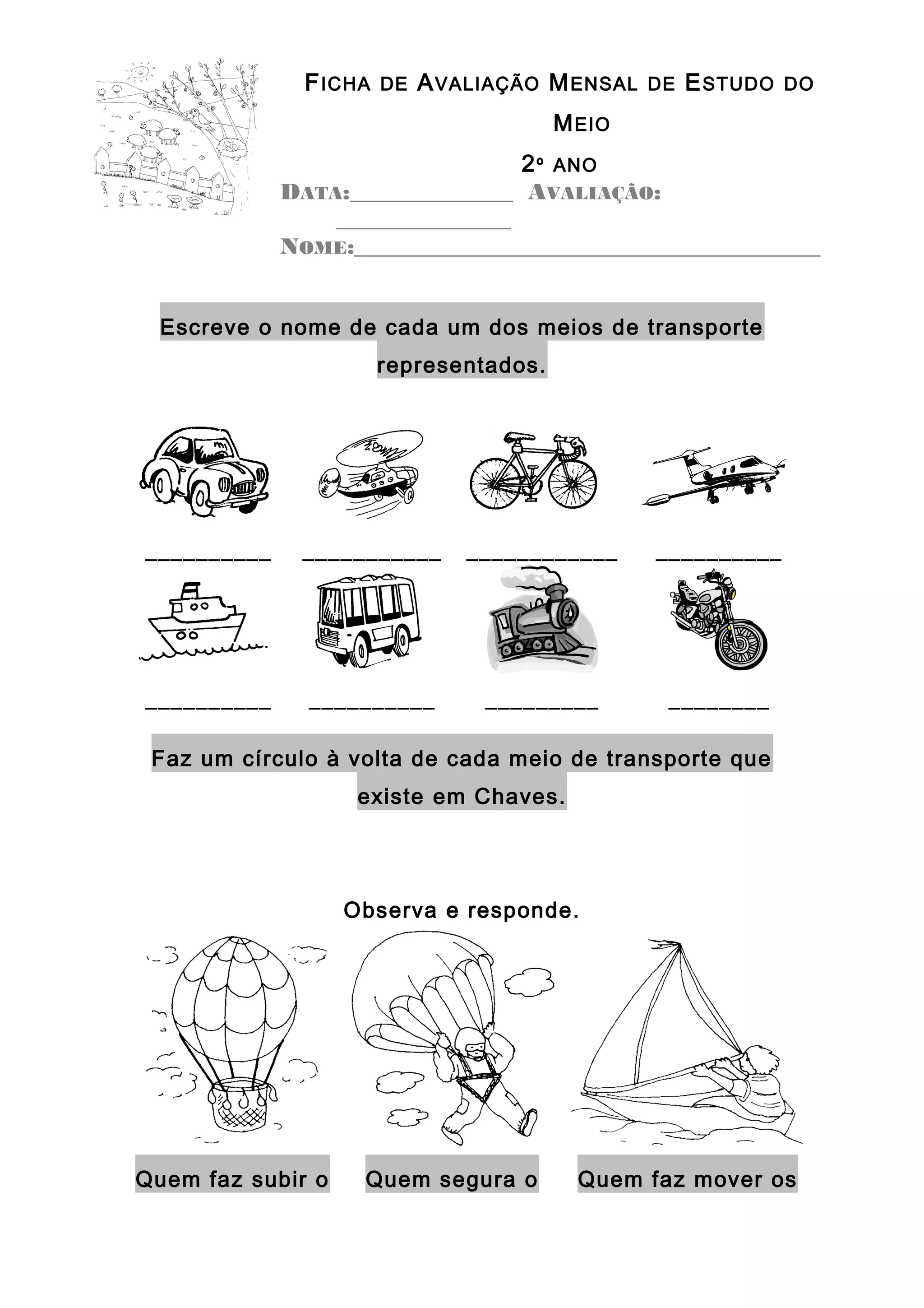 O documento é uma ficha de avaliação mensal de estudo do meio para o 2o ano. Contém perguntas sobre meios de transporte, como quais fazem subir balões, segurar pára-quedas e mover barcos à vela. Pede também para identificar meios de transporte representados, circular os que existem em Chaves e pintar itinerários casa-escola, casa-supermercado, casa-livraria e casa-jardim.