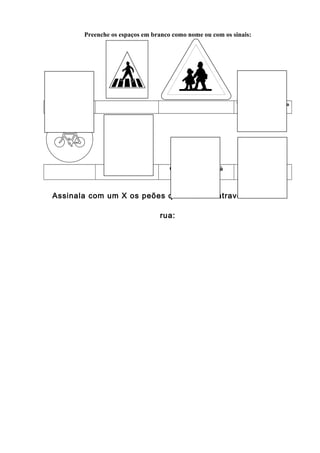 O documento é uma ficha de avaliação mensal de Estudo do Meio. A ficha pede para identificar a origem animal, vegetal ou mineral de alimentos listados e assinalar peões distraídos com um X. Também pede para preencher espaços em branco com nomes ou sinais de trânsito e assinalar peões que atravessam mal a rua com um X.
