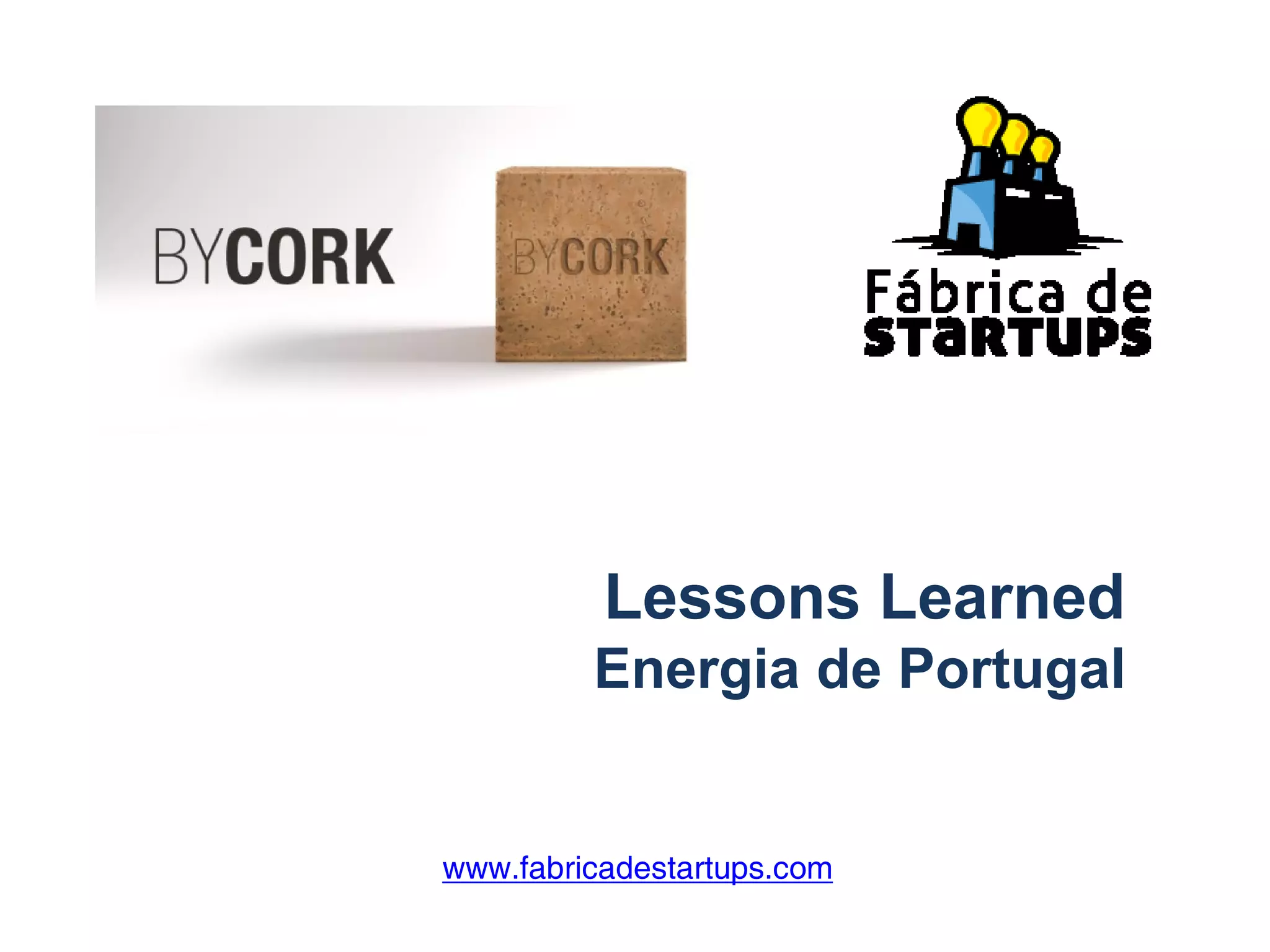 Este documento descreve o modelo de negócio da ByCork, uma empresa que usa cortiça para resolver problemas de espaço, acústica, isolamento térmico e segurança em empresas através de design criativo. Contém hipóteses testadas sobre segmentos de clientes, proposta de valor, canais de distribuição e atividades-chave, além de mostrar modelos de negócio e lições aprendidas.