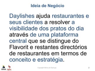 O documento discute as lições aprendidas de um projeto de startup chamado Daylishes, que visa ajudar restaurantes e clientes a resolver a visibilidade dos pratos do dia através de uma plataforma central. Várias hipóteses foram testadas e algumas validadas ou invalidadas, com resultados que alteraram o modelo de negócios original. Lições importantes incluem a necessidade de priorizar e ter uma estratégia para obter sucesso.
