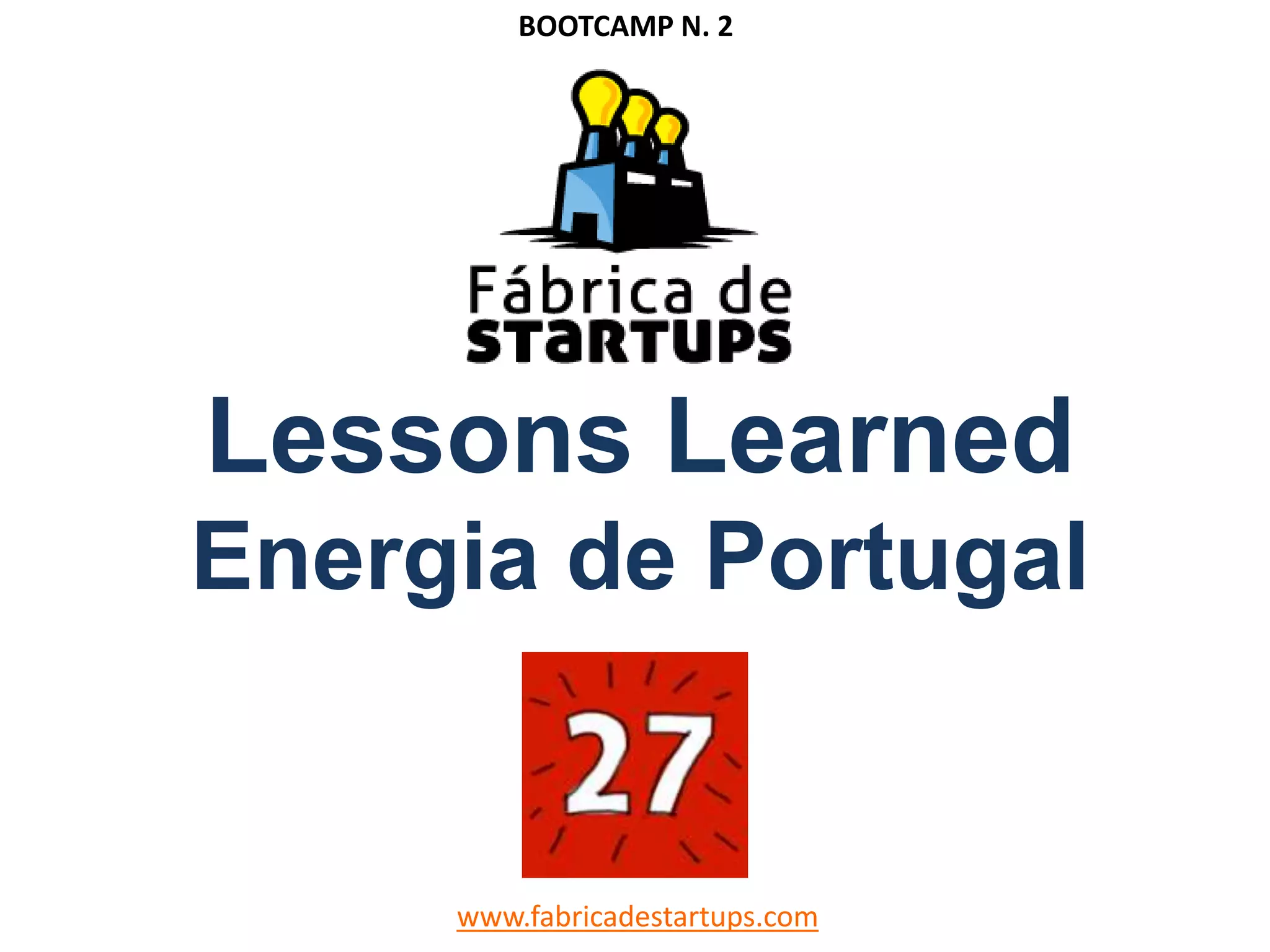 Este documento resume lições aprendidas de um bootcamp de startups. Algumas lições incluem: fazer tudo bem nem sempre compensa; é importante testar hipóteses com clientes potenciais; e os clientes devem ser o foco central do modelo de negócio.