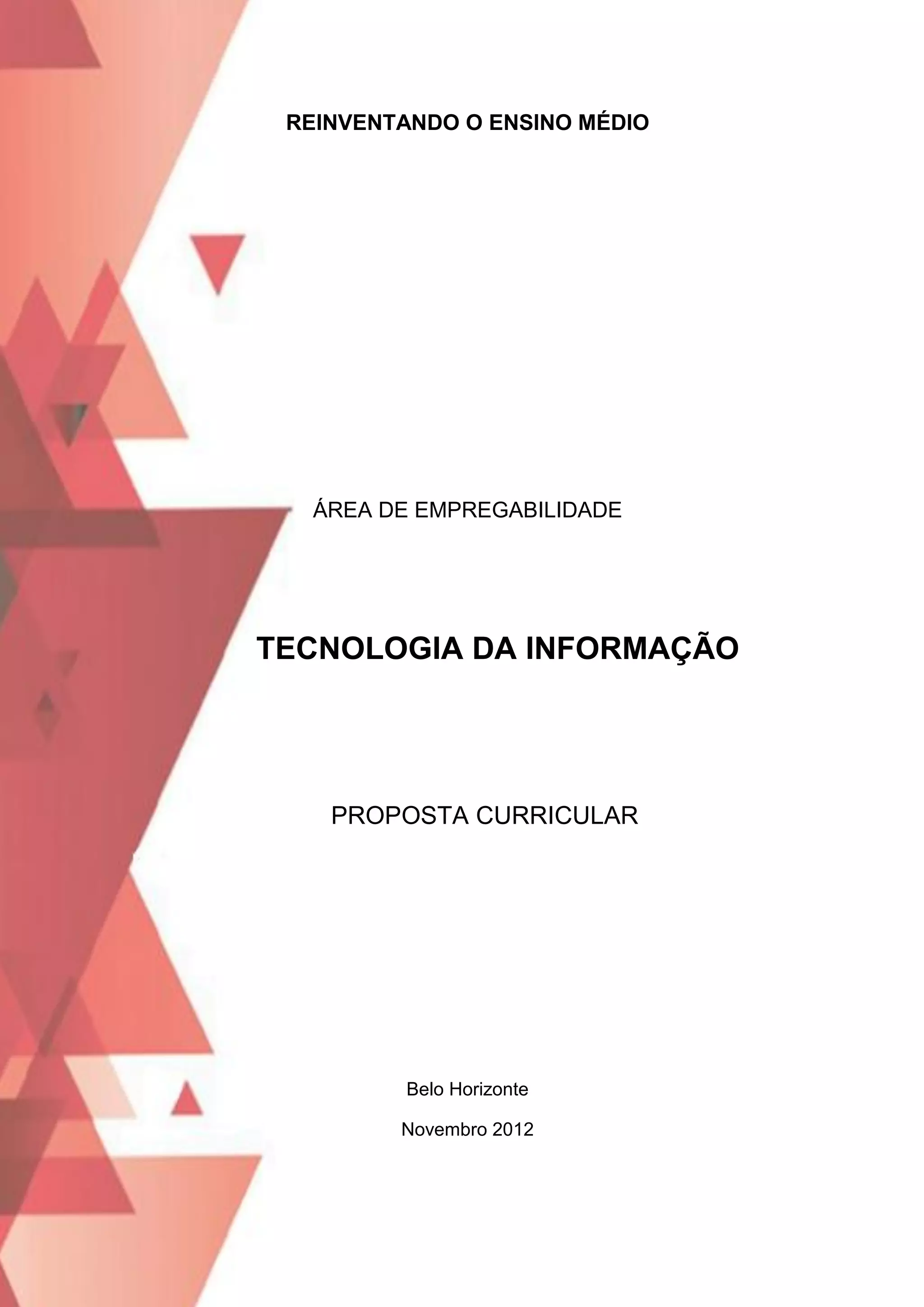 [1] O documento propõe um currículo para o ensino médio na área de tecnologia da informação com ênfase em computação e solução de problemas. [2] O currículo é dividido em três anos letivos com módulos teóricos e práticos que totalizam 15 módulos semanais e 600 horas anuais. [3] Os módulos abordam tópicos como introdução à computação, algoritmos, sistemas operacionais e aplicativos de escritório.