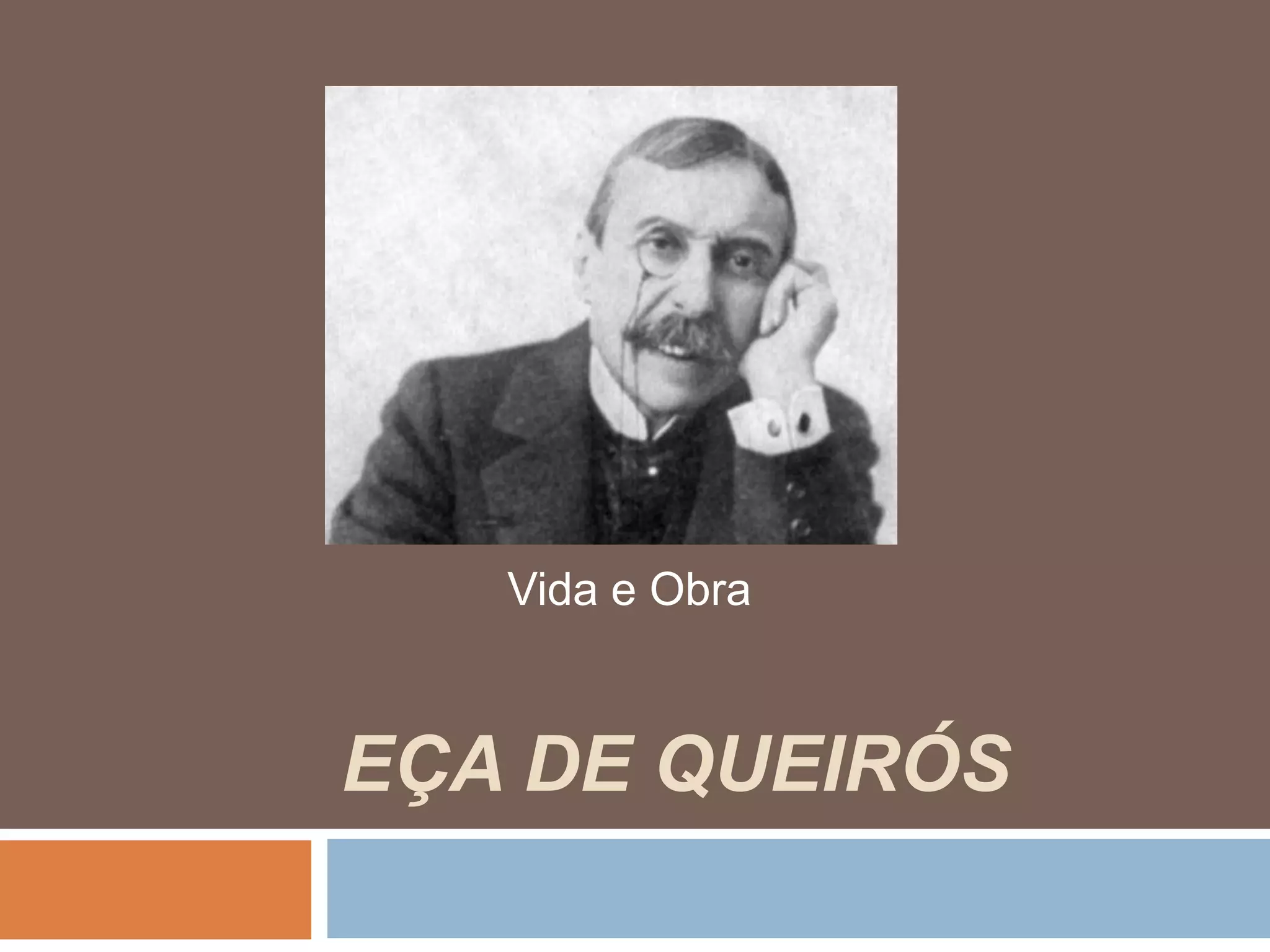 Eça de Queirós nasceu em 1845 de uma relação ilegítima e estudou Direito em Coimbra. Trabalhou como jornalista, administrador municipal e cônsul, período em que escreveu muitas obras influenciado pelo realismo de Flaubert. Faleceu em 1900 em Paris, deixando uma vasta obra que retratava a sociedade portuguesa com ironia.