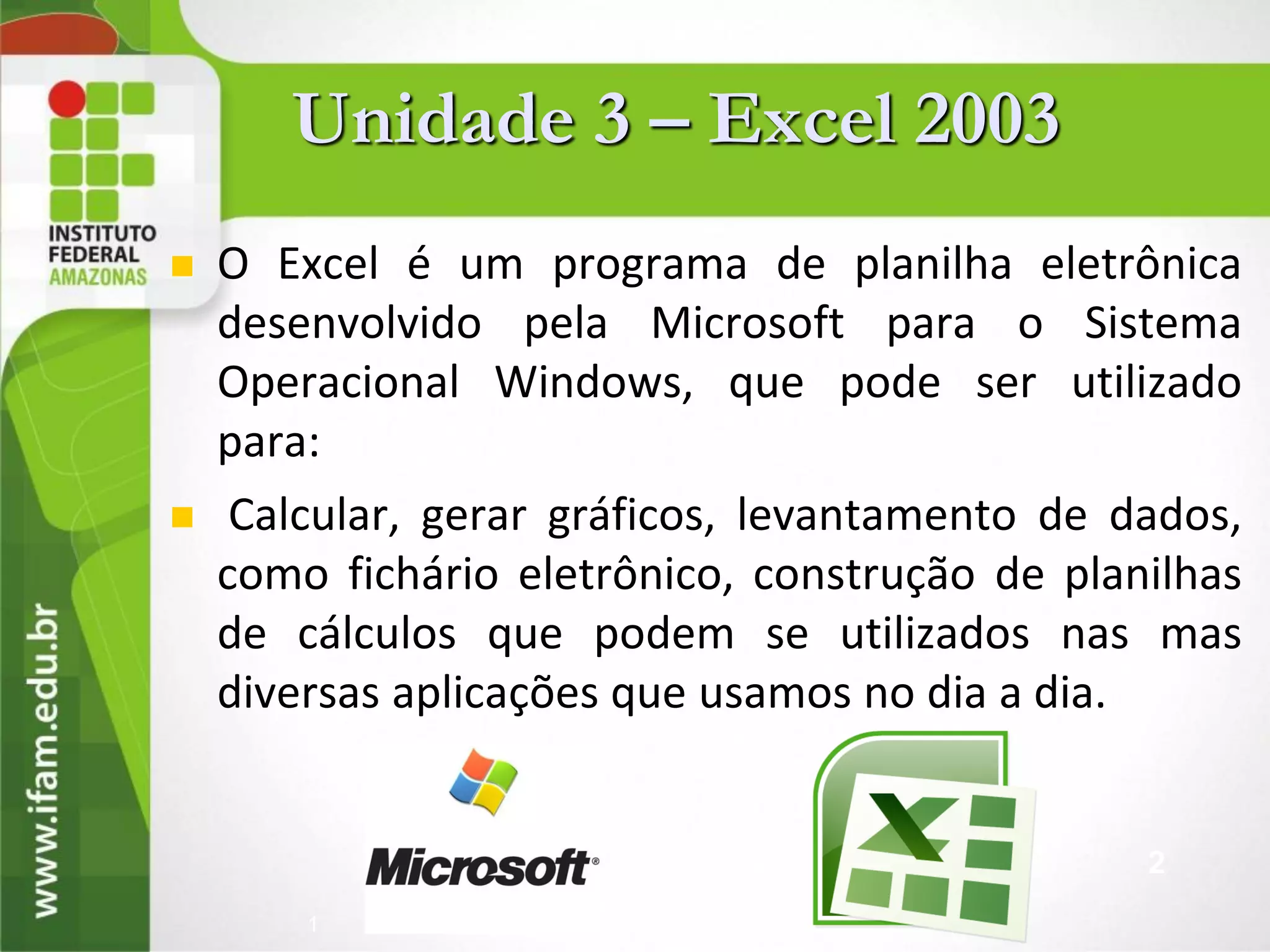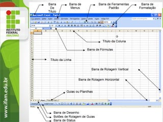 O documento descreve as principais funcionalidades do programa Excel, incluindo criação de planilhas, cálculos, gráficos e formatação condicional. Ele explica como abrir o Excel, como as células são organizadas em linhas e colunas, e como inserir e formatar dados. Também mostra como gerar gráficos a partir de dados na planilha e como esses gráficos podem ser customizados.