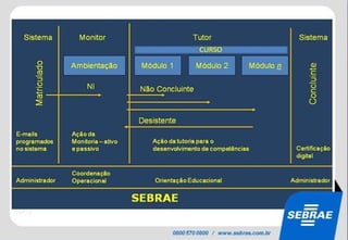 O documento descreve a missão e visão da WebAula de ajudar empreendedores a alcançarem melhores resultados por meio de educação a distância na internet. Ele lista cursos oferecidos sobre empreendedorismo, finanças, vendas, atendimento ao cliente e gestão. Também mostra indicadores de desempenho como matrículas, atendimentos e avaliação da tutoria.