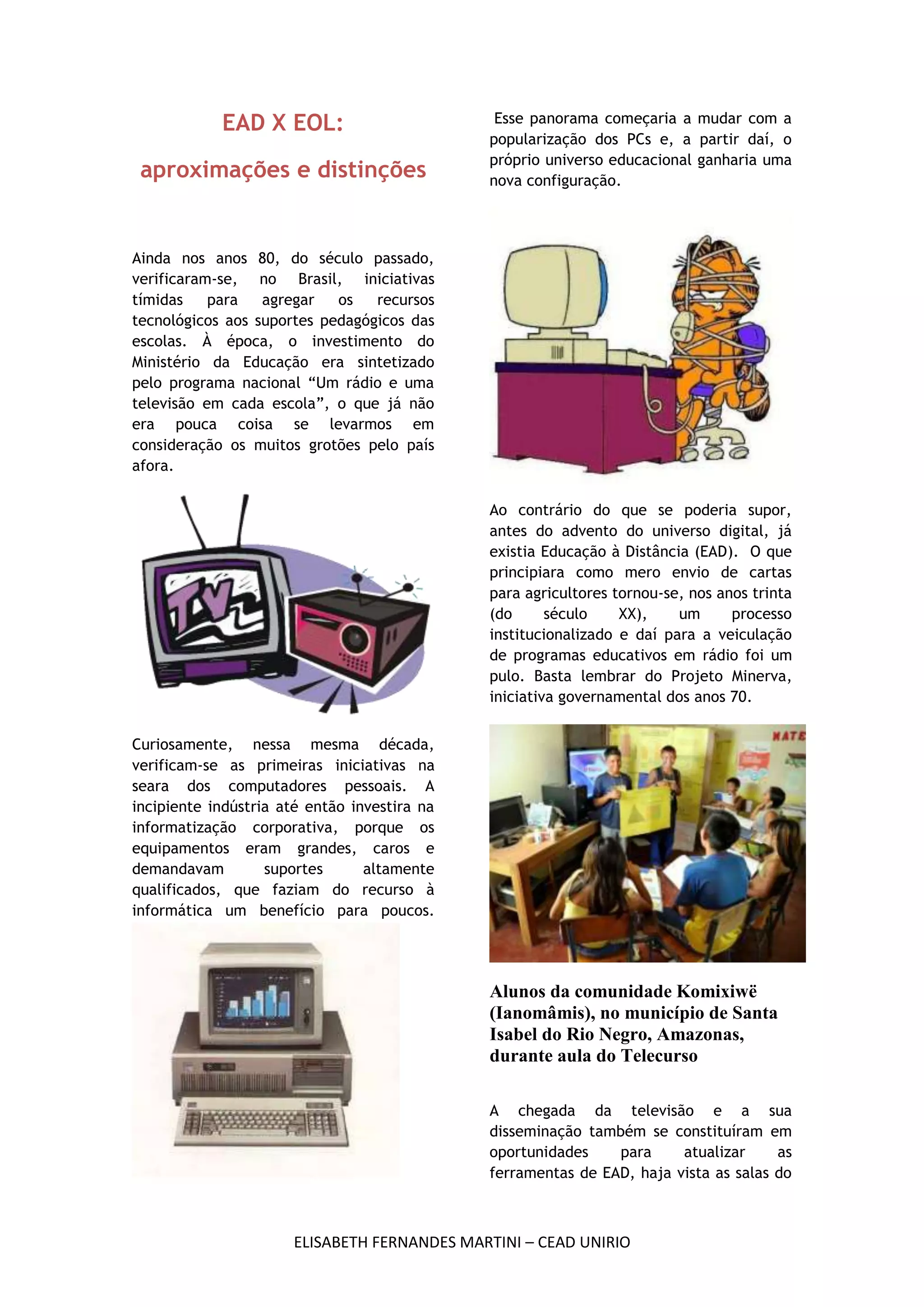 Este documento discute as aproximações e distinções entre Educação a Distância (EAD) e Educação Online (EOL). Apresenta como a EAD existia antes da era digital através de cartas e rádio, mas era vista como compensatória. A chegada dos computadores pessoais e da internet permitiu novas formas de EOL que envolvem mais interação, podendo ser síncrona ou assíncrona. Embora EAD e EOL tenham pontos em comum, a EOL depende mais da troca entre os envolvidos para ser efet
