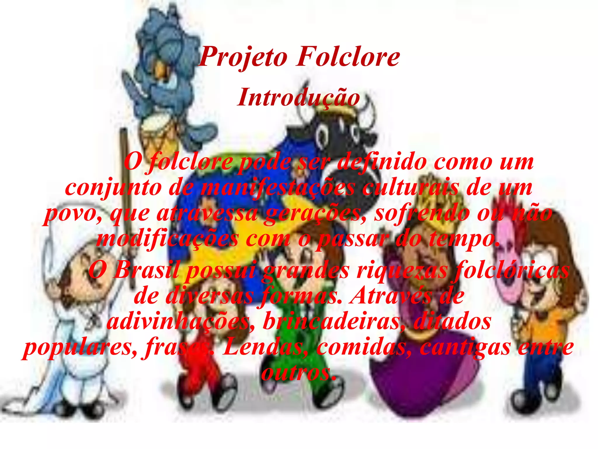 O projeto apresenta atividades sobre o folclore brasileiro para alunos do pré ao 4o ano utilizando o laboratório de informática. As atividades incluem vídeos sobre lendas, jogos educativos sobre personagens e ditados populares de acordo com cada série. O objetivo é explorar e diversificar os conhecimentos dos alunos sobre o folclore.