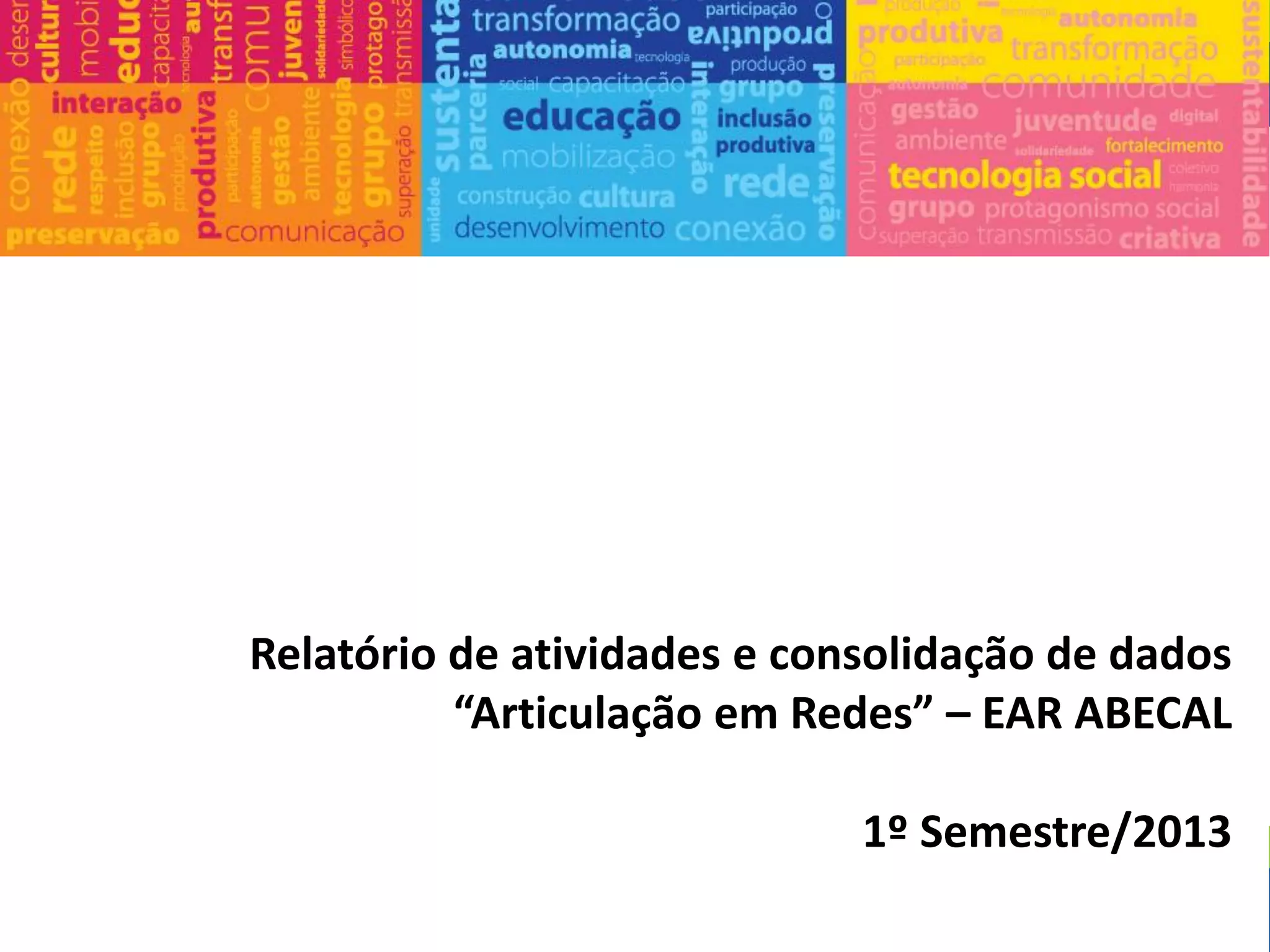 O relatório resume as atividades da EAR ABECAL no primeiro semestre de 2013, como a articulação com 121 Estações Digitais, o envio de computadores, materiais visuais e visitas a 91 estações para revitalização. 75% da meta inicial de revitalização foi alcançada. Contatos frequentes com as estações incluíram ligações, emails e mídias sociais.