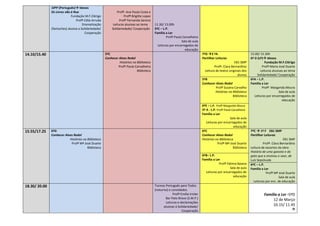 O documento apresenta o plano de atividades para a Semana da Leitura na Escola EB 2,3/ S de S. MARTINHO DO PORTO de 5 a 9 de Março de 2012. O plano inclui várias atividades de leitura em diferentes horários conduzidas por professores em salas de aula e bibliotecas da escola e em instituições da comunidade como a Fundação M.F. Clérigo. As atividades envolvem alunos, familiares e idosos e abordam temas como solidariedade e cooperação.