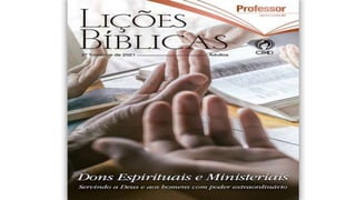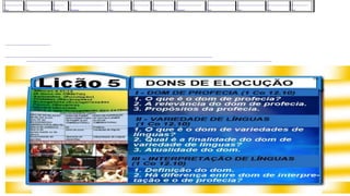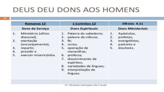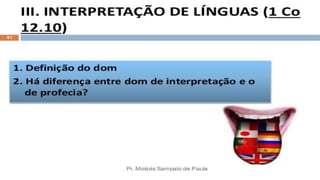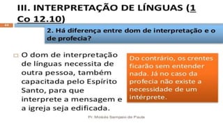 O documento discute três dons espirituais mencionados na Bíblia: a profecia, a variedade de línguas e a interpretação de línguas. Ele define cada dom e discute sua relevância e propósito, argumentando que apesar de algumas visões cessacionistas, Deus continua abençoando os crentes com esses dons hoje.