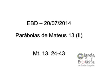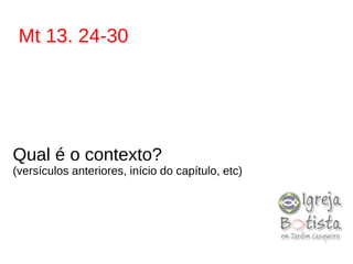 Este documento resume a parábola das ervas daninhas contada por Jesus em Mateus 13:24-30. Ele explica que Jesus falou desta parábola após ser rejeitado, e que representa como o Reino dos Céus crescerá com justos e injustos até a colheita final, quando Deus separará o joio do trigo.
