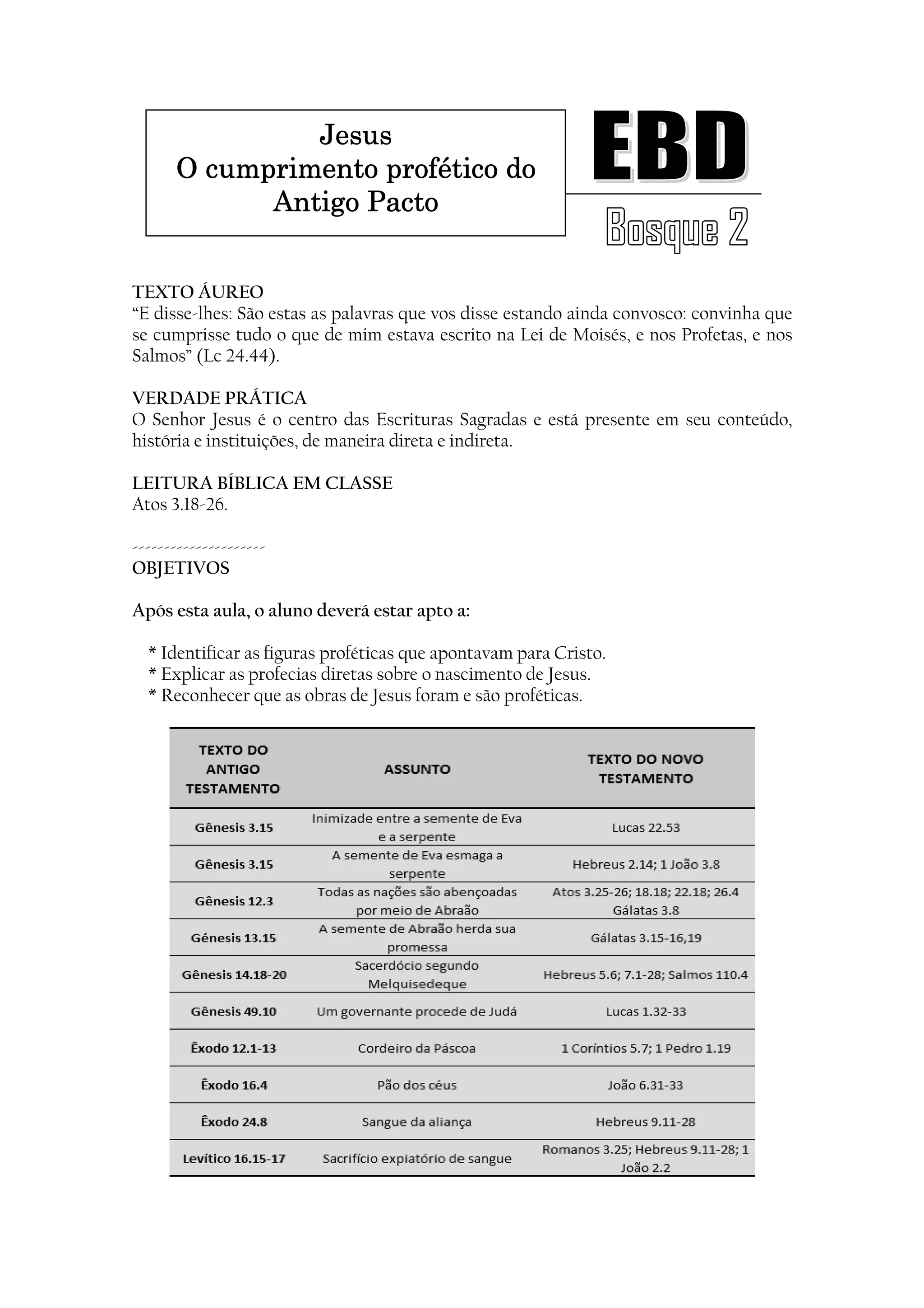 O documento discute como Jesus cumpriu as profecias do Antigo Testamento. Ele identifica figuras e instituições proféticas como o cordeiro pascal, o tabernáculo e o sacerdócio que apontavam para Cristo. Também explica profecias diretas sobre o nascimento, vida, morte e ressurreição de Jesus encontradas nas Escrituras.