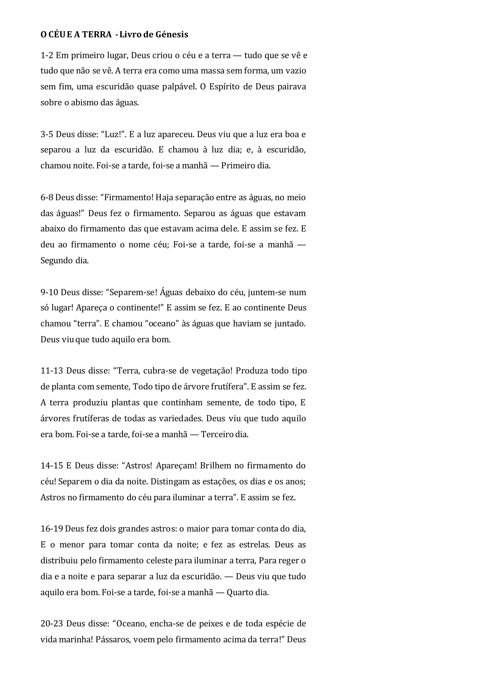 O documento descreve a criação do mundo em sete dias segundo o livro do Gênesis. No primeiro dia, Deus criou a luz e separou a luz das trevas. Nos dias seguintes, Ele criou o céu, a terra, as plantas, os astros, os animais e, finalmente, o homem e a mulher. No sétimo dia, Deus descansou de Sua obra.