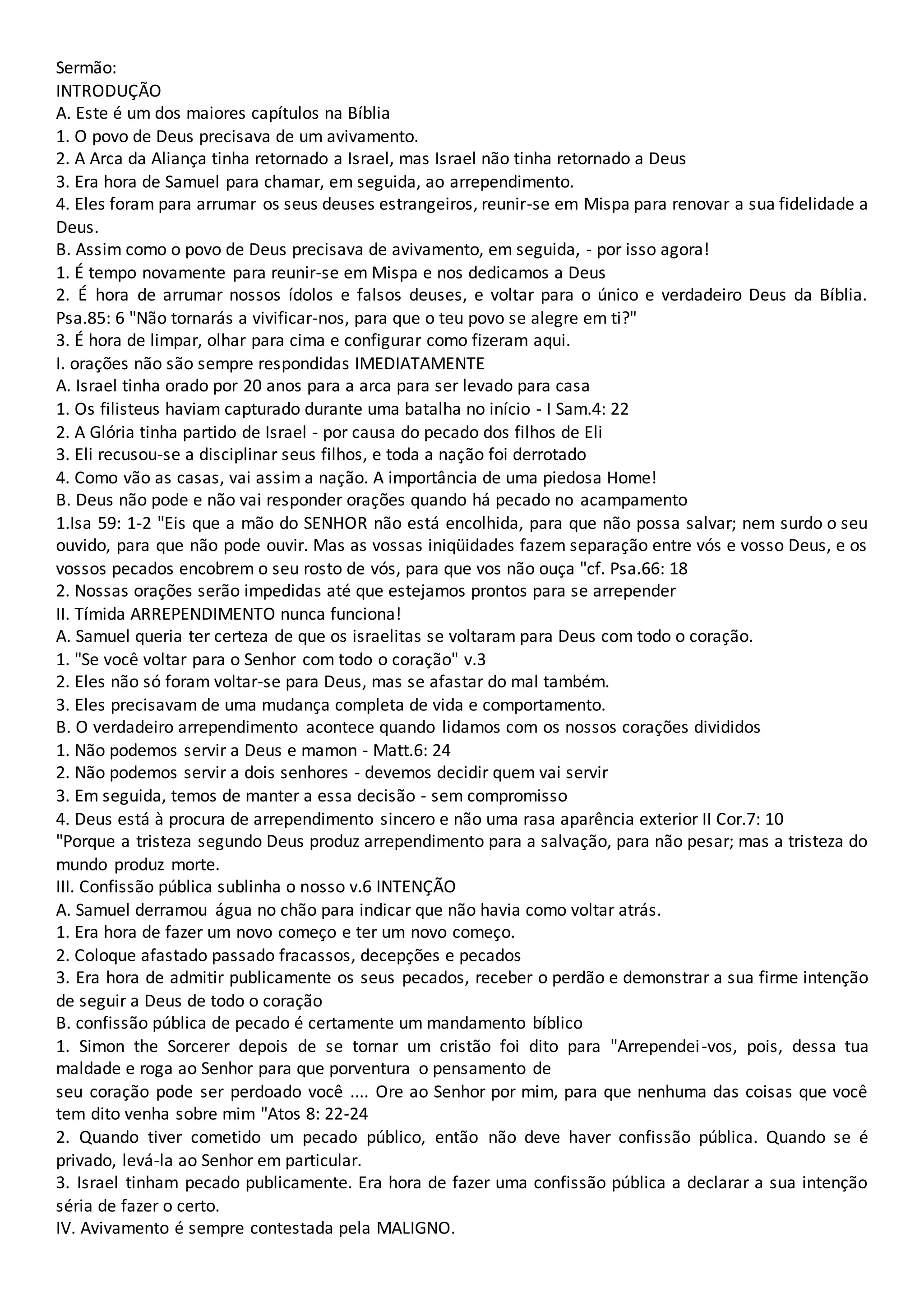1) O povo de Israel precisava de um avivamento espiritual para se afastar dos deuses falsos e voltar completamente para Deus. 2) Samuel pediu ao povo que se arrependesse sinceramente de seus pecados públicos e confessasse a Deus com todo o coração. 3) Após o povo se arrepender, Deus ajudou Israel em sua batalha contra os filisteus, mostrando que o avivamento espiritual traria vitória, não importando a oposição.