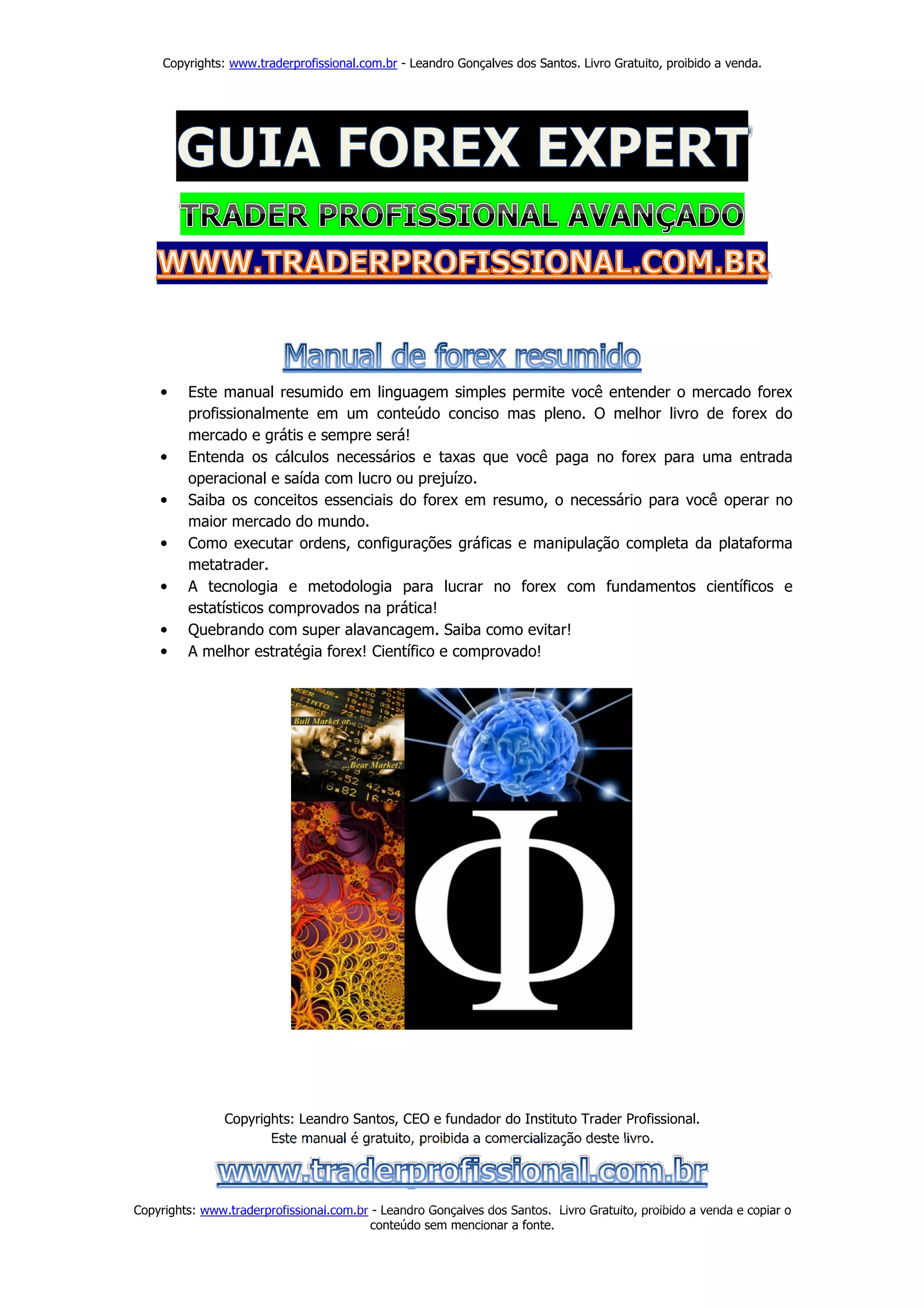 O documento descreve um livro gratuito sobre operações no mercado Forex. O livro ensina conceitos básicos do Forex de forma concisa, como cálculos necessários, taxas e estratégias comprovadas cientificamente para lucrar no maior mercado financeiro do mundo. O livro também discute como evitar riscos com alavancagem excessiva.