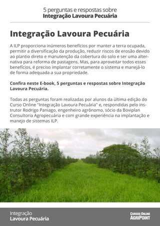 Este documento resume as perguntas e respostas de um curso online sobre Integração Lavoura Pecuária. O instrutor responde perguntas sobre a viabilidade da ILP para pequenos produtores, a aplicação da técnica na pecuária leiteira e espécies florestais indicadas para o sistema ILPF.