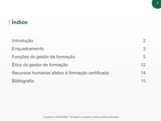 O e-book aborda os requisitos e funções do gestor de formação, que é essencial para a certificação de entidades formadoras segundo as diretrizes da DGERT. O documento detalha as responsabilidades, como planeamento e avaliação da formação, além dos princípios éticos que devem ser seguidos. Também menciona a necessidade de recursos humanos qualificados para o sucesso das atividades formativas.
