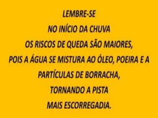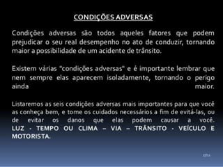 O documento discute condições adversas no trânsito e estratégias de direção defensiva. Apresenta os componentes de uma equipe de direção defensiva e discute 5 elementos essenciais, como conhecimento, atenção, previsão, decisão e habilidade. Também explora condições adversas como tempo chuvoso, neblina, trânsito pesado e locais com pouca iluminação, enfatizando a importância de se adaptar a essas situações.