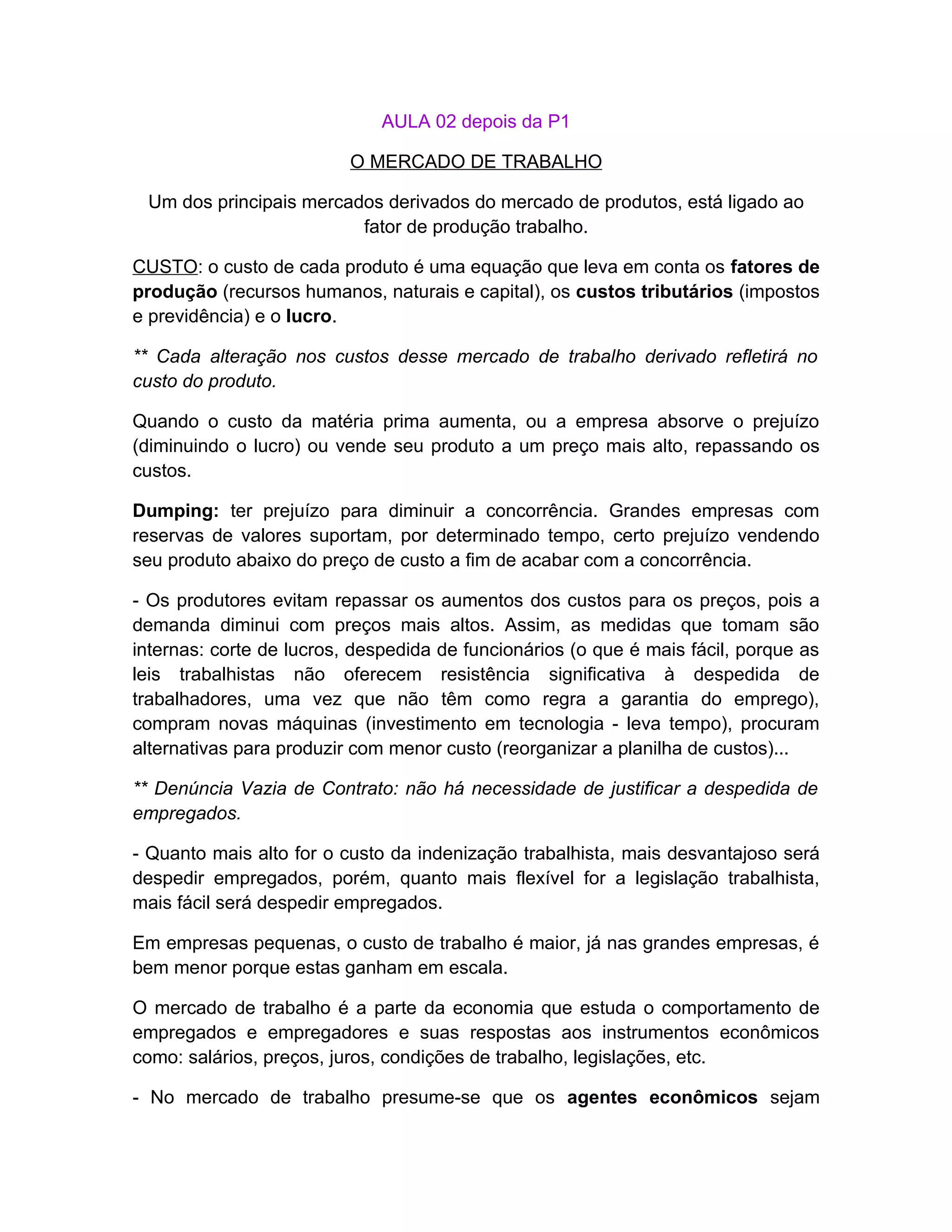 O documento discute o mercado de trabalho e como os custos de produção afetam os preços dos produtos. Ele explica que os custos de mão de obra são considerados no cálculo dos custos totais de produção e que as empresas tentam evitar repassar aumentos nos custos para os consumidores. As empresas buscam cortar custos internamente, como reduzindo lucros ou demitindo funcionários.