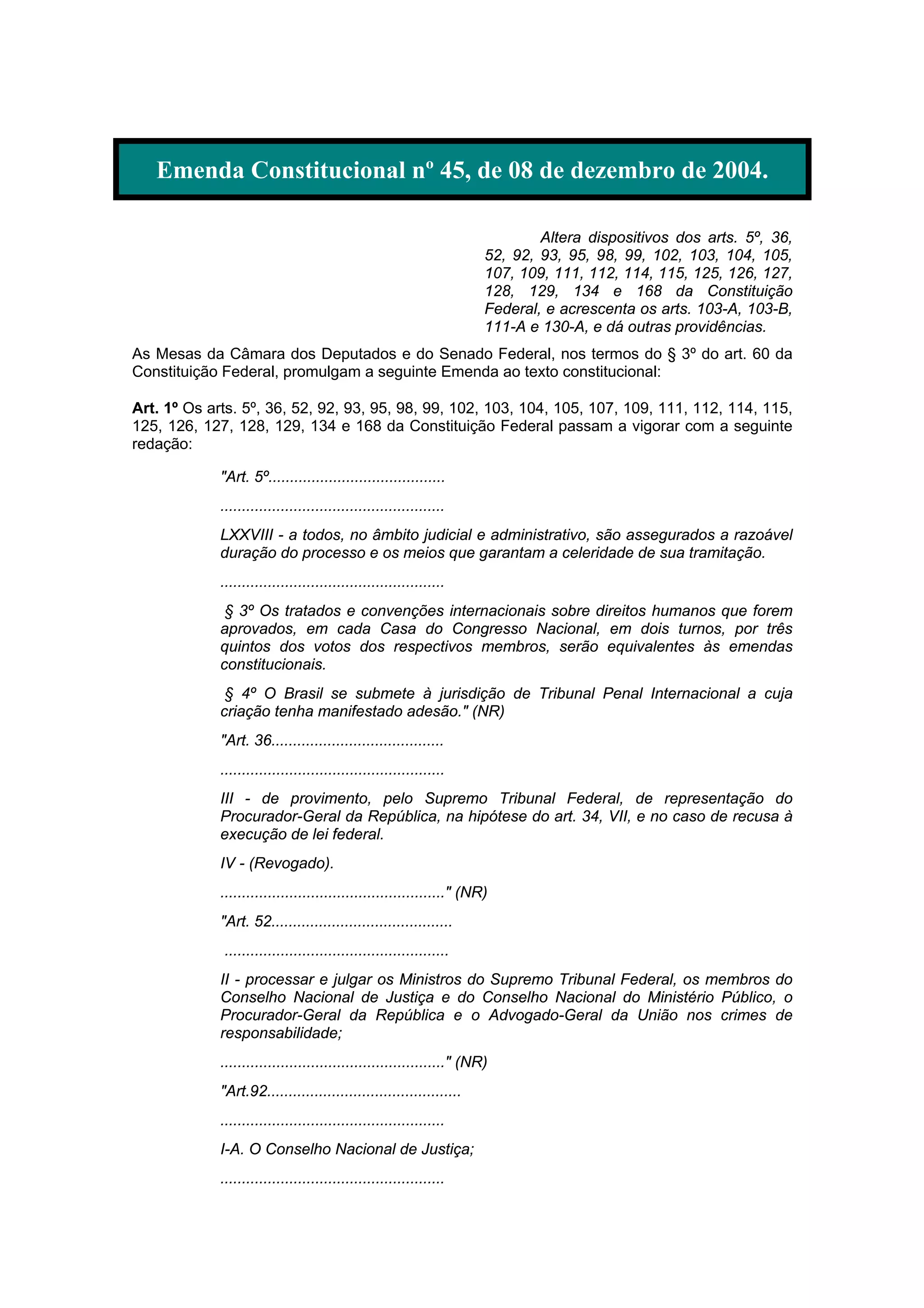 A Emenda Constitucional no 45 de 2004 alterou diversos artigos da Constituição Federal relacionados ao Poder Judiciário, incluindo mudanças na estrutura, organização e competências do Supremo Tribunal Federal, Superior Tribunal de Justiça, Tribunais Regionais Federais e Justiça do Trabalho.