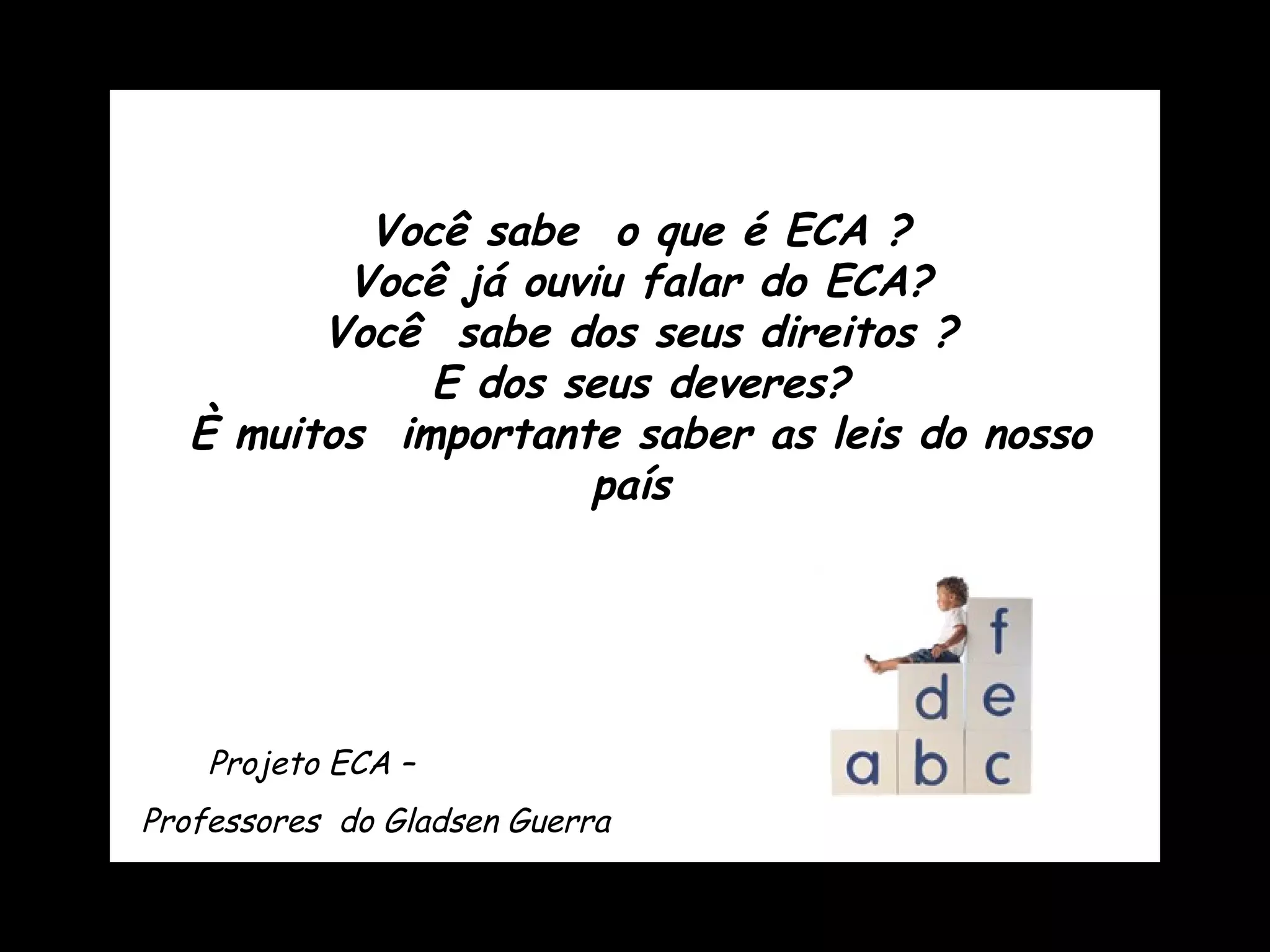 1) O ECA é a Lei no 8.069 de 1990 que regulamenta os direitos e deveres de crianças e adolescentes na Constituição Federal.
