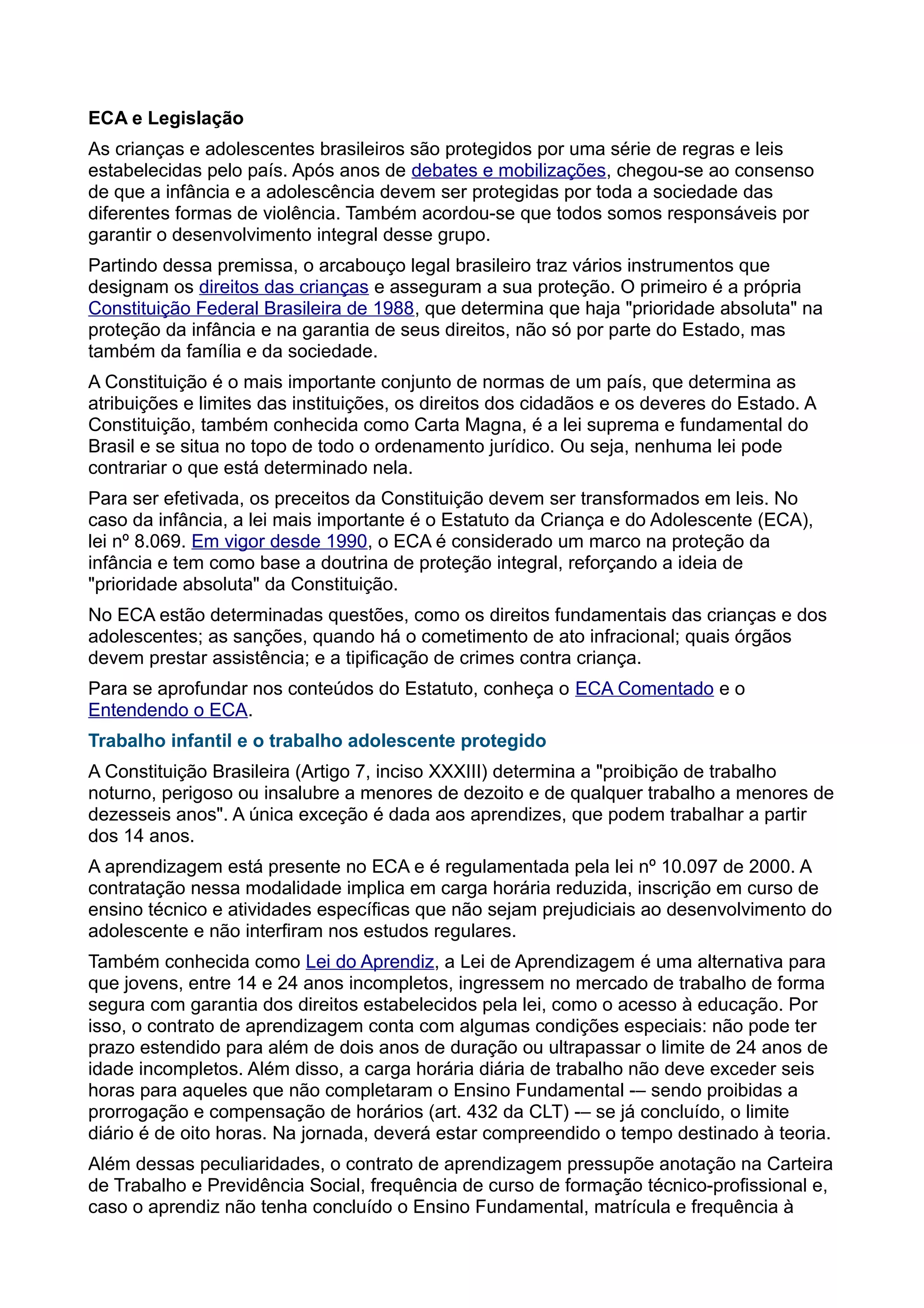 A proteção da infância e adolescência no Brasil é garantida por leis como a Constituição Federal de 1988 e o Estatuto da Criança e do Adolescente de 1990. Estas leis determinam direitos como prioridade absoluta na proteção da infância e proíbem o trabalho antes dos 16 anos, exceto aprendizagem a partir dos 14 anos. O país também assinou convenções internacionais sobre os direitos da criança e contra o trabalho infantil.