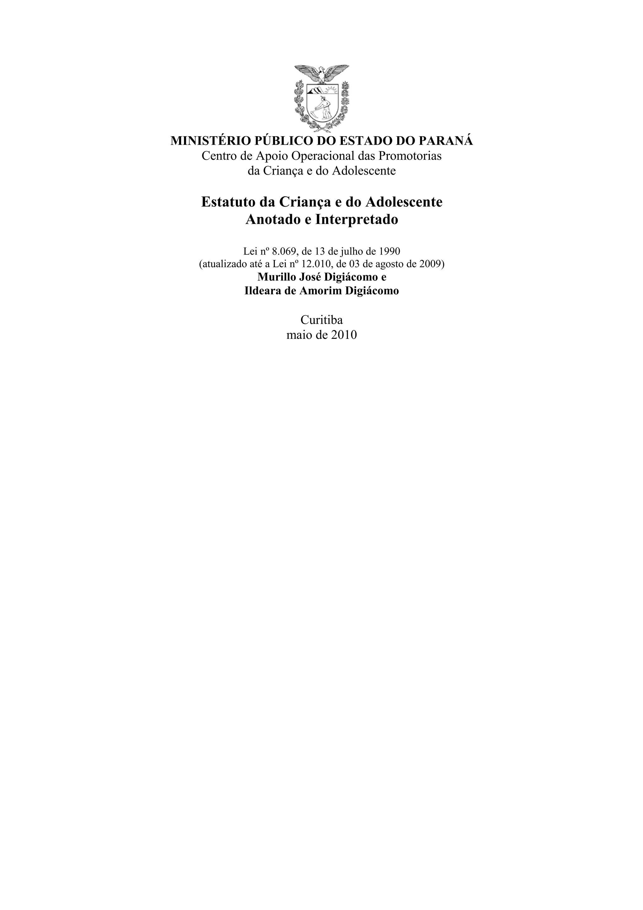 Este documento apresenta um prefácio para o livro "Estatuto da Criança e do Adolescente Anotado e Interpretado" escrito por Murillo José Digiácomo e Ildeara de Amorim Digiácomo. O prefácio destaca a importância da obra para a implementação dos direitos das crianças e adolescentes previstos na Constituição e no Estatuto da Criança e do Adolescente. Também enfatiza o papel dos Conselhos de Direitos, do Ministério Público e do Poder Judiciário na efetivação