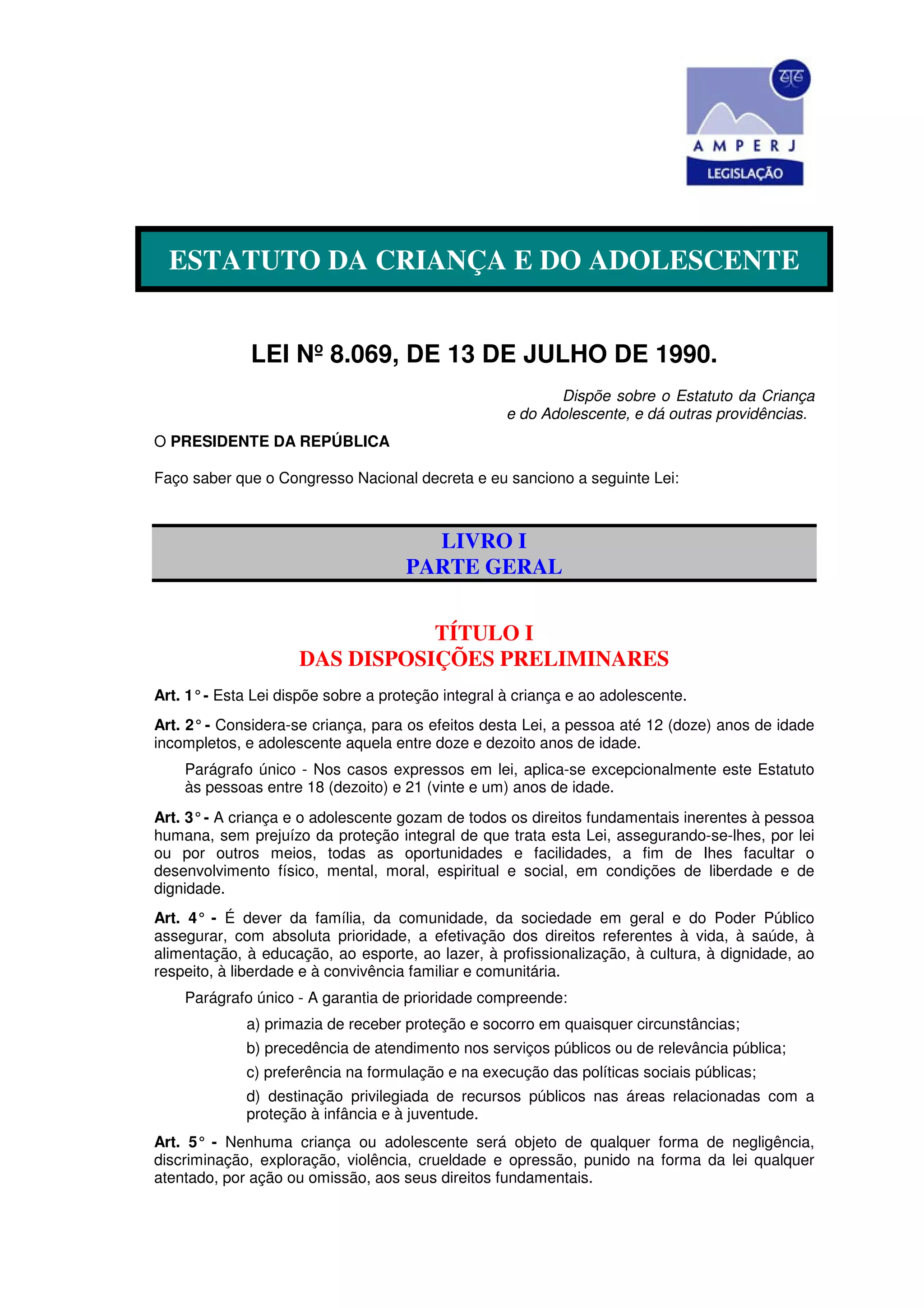 Este documento apresenta o Estatuto da Criança e do Adolescente, que estabelece as diretrizes para a proteção integral de crianças e adolescentes no Brasil. O estatuto define criança como pessoa até 12 anos incompletos e adolescente como pessoa entre 12 e 18 anos, garantindo seus direitos fundamentais. Também determina os deveres da família, sociedade e poder público em assegurar prioritariamente os direitos à vida, saúde, educação e dignidade das crianças e adolescentes.