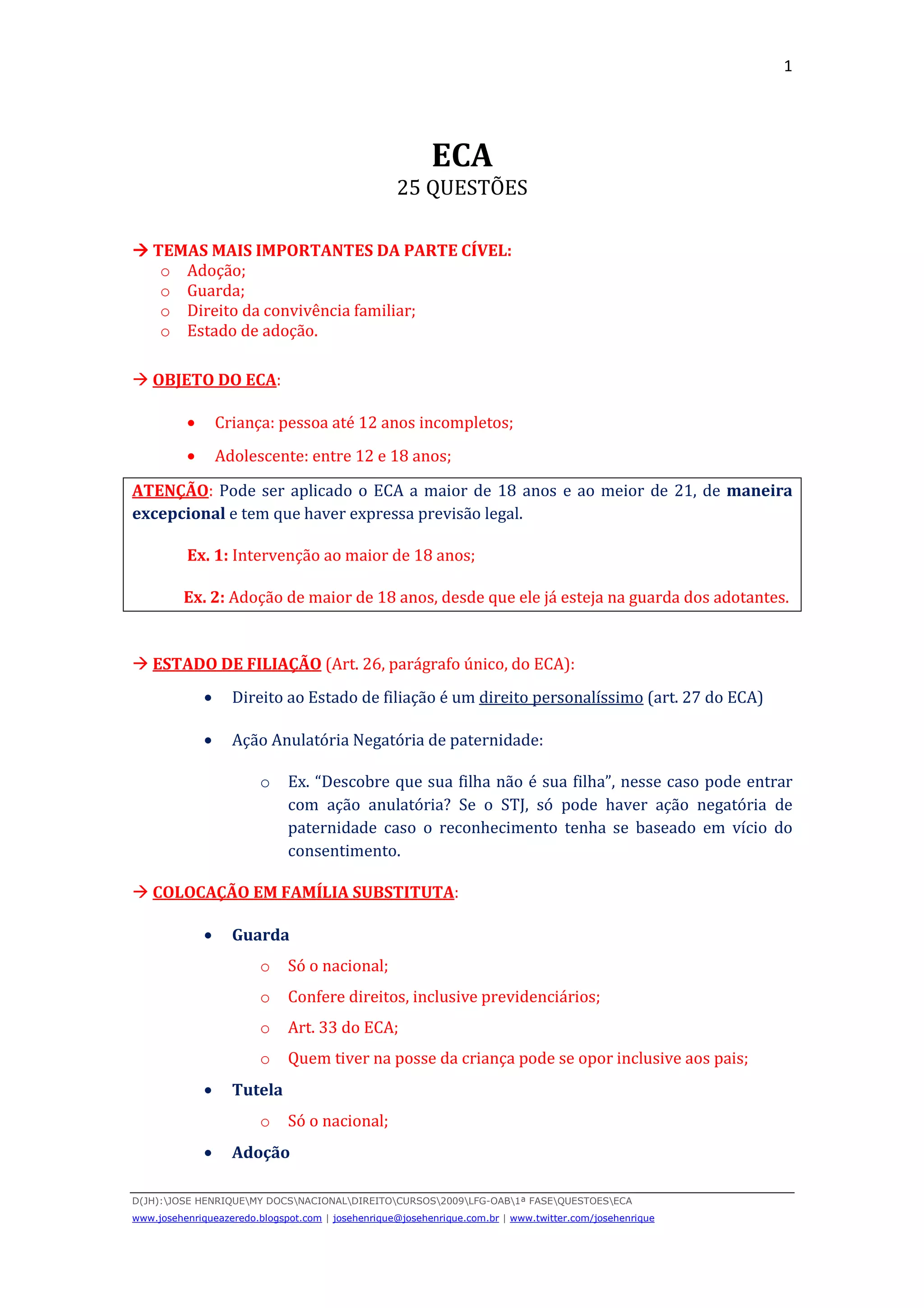 O documento resume os principais pontos do Estatuto da Criança e do Adolescente (ECA) sobre: 1) objetos do ECA como criança, adolescente e estado de filiação; 2) colocação em família substituta como guarda, tutela e adoção; 3) competência da Justiça da Infância e Juventude.