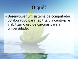 O documento propõe o desenvolvimento de um sistema de caronas online e gratuito para facilitar a carona entre estudantes e funcionários da universidade. Isso reduziria o tráfego, a poluição e os gastos com combustível, melhorando a qualidade de vida e promovendo a sustentabilidade de forma econômica, social e ambiental. O código do sistema seria disponibilizado gratuitamente para outras instituições.