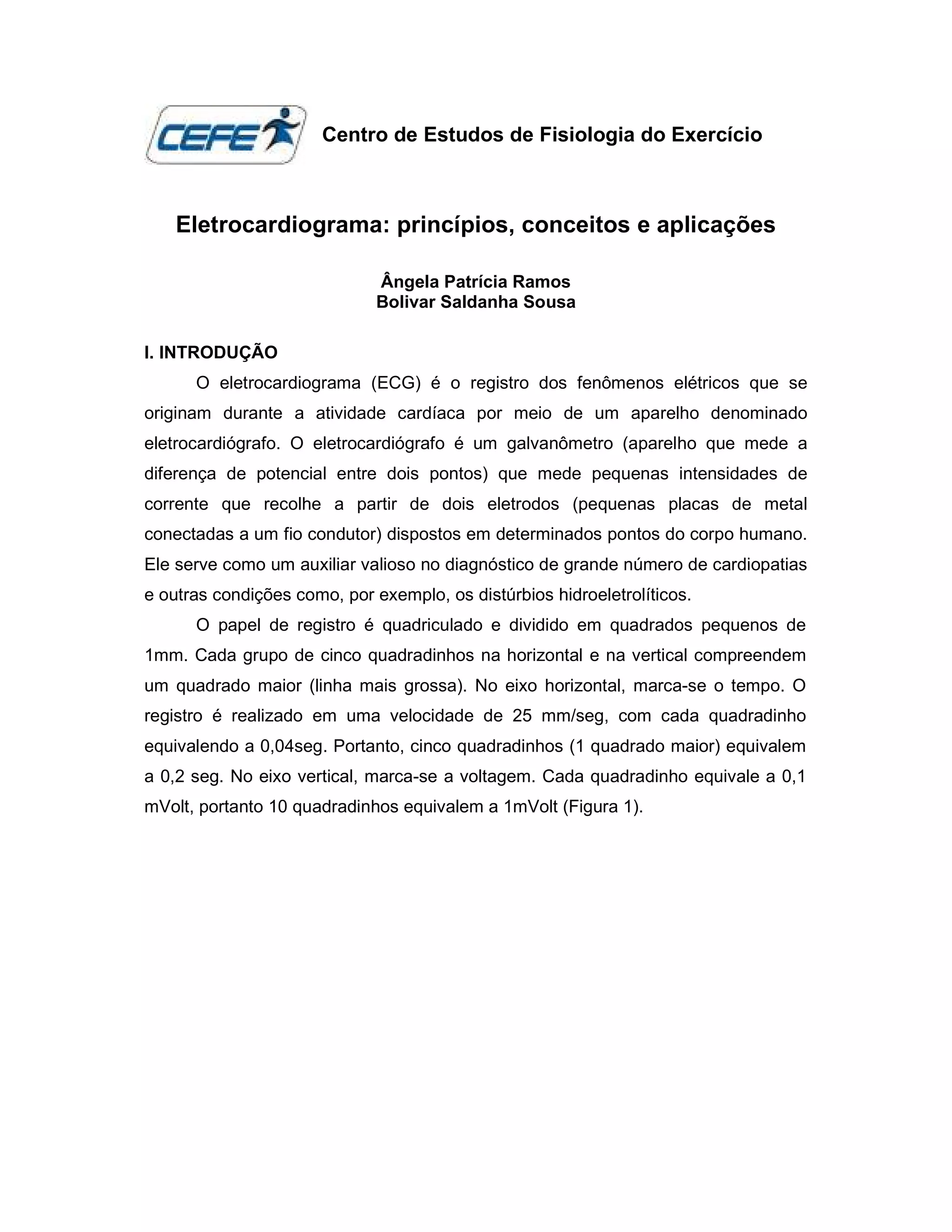 O documento descreve os princípios do eletrocardiograma, incluindo como mede a atividade elétrica do coração através de eletrodos, a análise das ondas P, QRS e T, e as derivações frontais e precordiais. Também explica conceitos de eletrofisiologia cardíaca e analisa anomalias como arritmias, taquicardias e fibrilações.