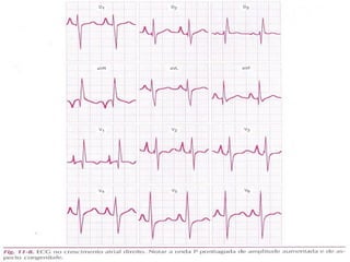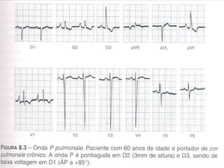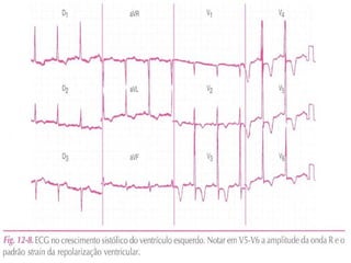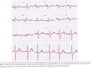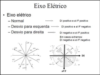 O documento discute determinação do eixo elétrico cardíaco e hipertrofia ventricular esquerda e direita. Ele fornece detalhes sobre os critérios diagnósticos para sobrecarga atrial esquerda e direita usando índices como o de Macruz e Morris. Também descreve o critério de Romhilt e Estes para diagnóstico de hipertrofia ventricular esquerda.