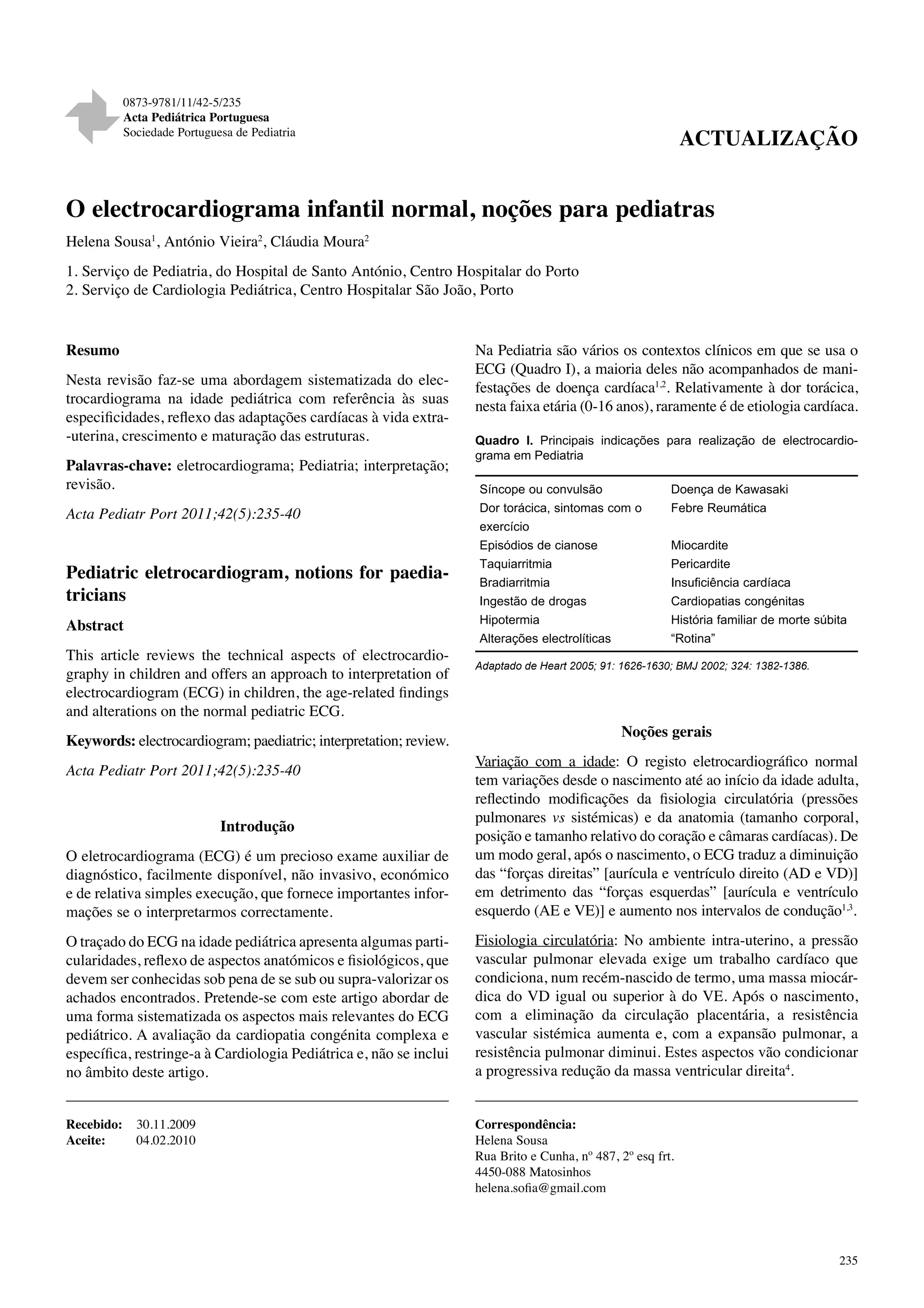 Este documento discute as características normais do eletrocardiograma (ECG) em crianças e fornece orientações para a interpretação do ECG pediátrico. O ECG na idade pediátrica apresenta variações normais relacionadas à idade que refletem as adaptações cardíacas à vida extrauterina. O documento descreve os aspectos técnicos do ECG pediátrico e fornece valores de referência para a avaliação do traçado.