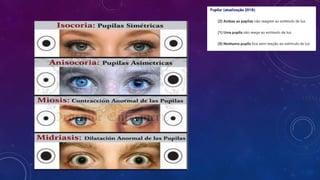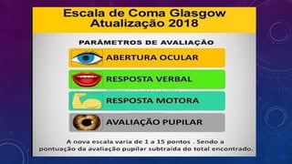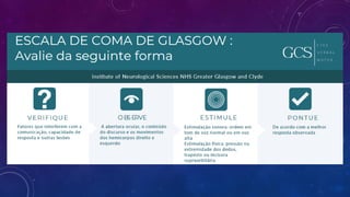 O documento descreve a Escala de Coma de Glasgow (ECG), que é utilizada para avaliar o nível de consciência de pacientes. A ECG classifica o estado do paciente em três parâmetros: abertura ocular, resposta verbal e resposta motora. Um escore mais alto indica melhor estado neurológico, enquanto um escore mais baixo sugere piora no estado do paciente. O documento fornece exemplos de como aplicar a ECG e interpretar os resultados.