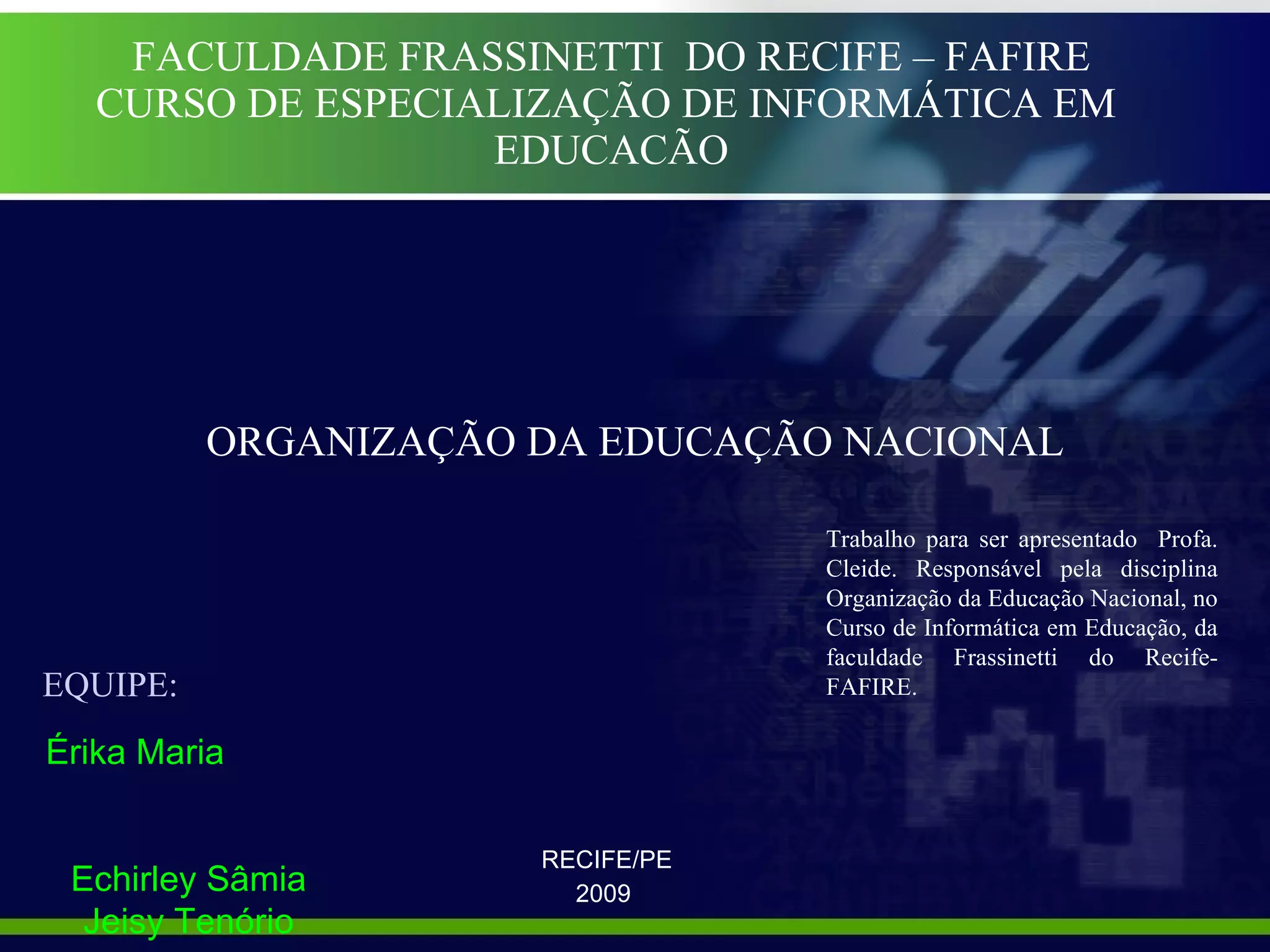 O documento apresenta a utilização do podcast como uma tecnologia educacional no curso de especialização em informática em educação da Faculdade Frassinetti do Recife. Destaca os benefícios do podcast para a dinâmica das aulas e a interação entre alunos e professores, além de proporcionar acesso flexível aos conteúdos educacionais. A conclusão ressalta que o podcast pode humanizar as relações e estimular a aprendizagem independente dos alunos.