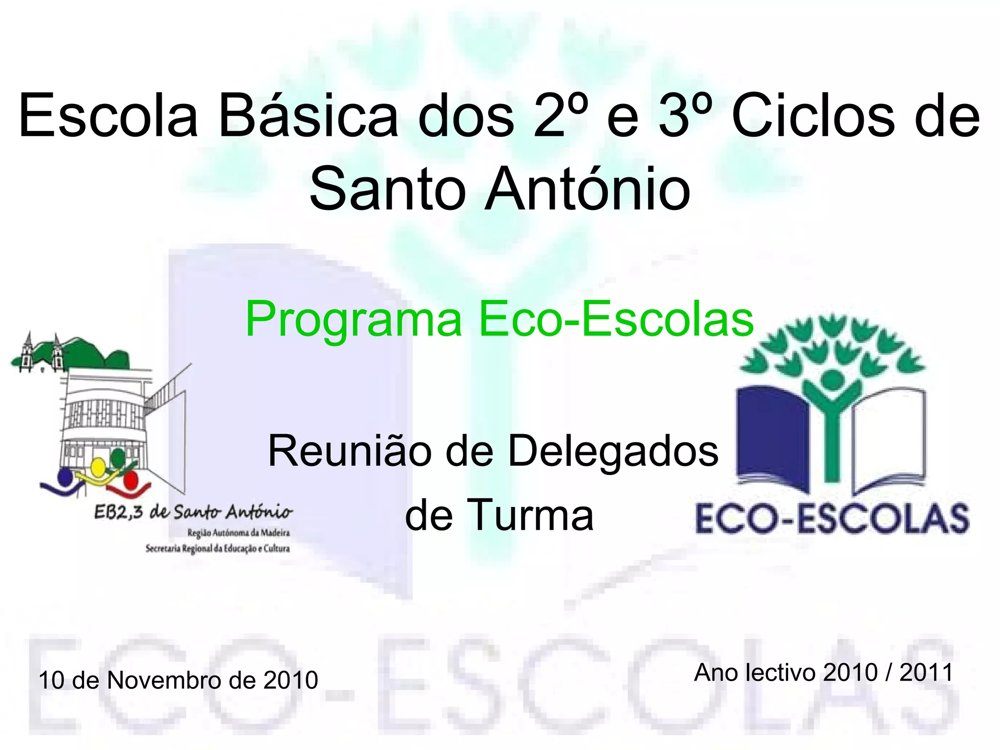 Este documento descreve um programa ambiental implementado na Escola Básica Santo António para promover ações em prol do meio ambiente. O programa Eco-Escolas já está na escola há 3 anos e recebeu o prêmio "bandeira verde" por seu trabalho. O documento incentiva os alunos a participarem do conselho Eco-Escolas, cumprirem o código ambiental da escola e promoverem a reciclagem.