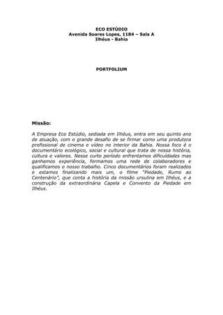 O documento apresenta o portfólio da produtora de cinema e vídeo Eco Estúdio, sediada em Ilhéus, Bahia. A empresa atua há 5 anos produzindo documentários sobre a história, cultura e meio ambiente local. Foram realizados 5 documentários e estão finalizando mais um sobre a história da missão ursulina em Ilhéus. O diretor Paulo Paiva também possui extensa experiência em produções audiovisuais na região.
