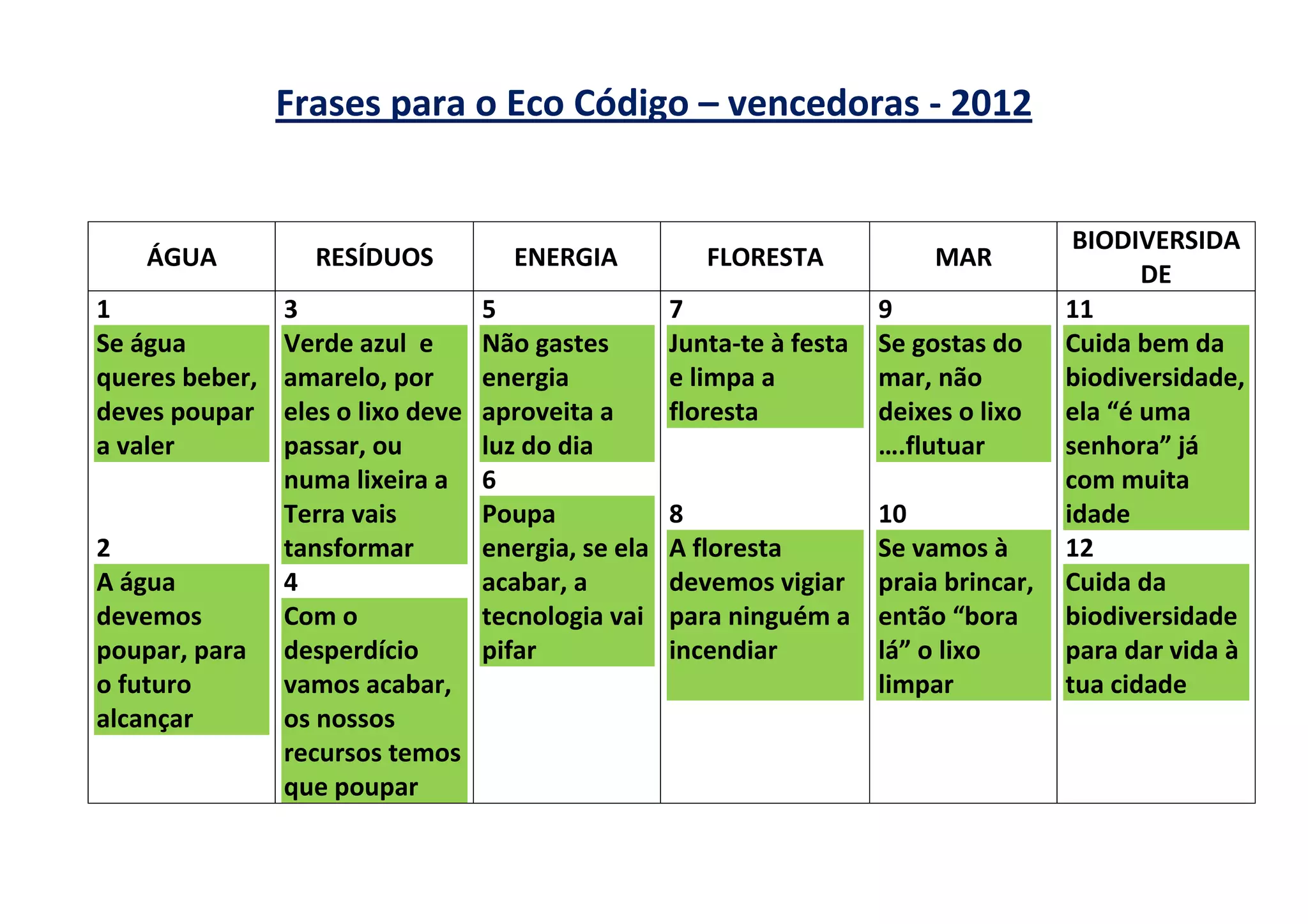 1) O documento apresenta 12 frases vencedoras de um concurso sobre eco-códigos, divididas em 6 categorias: água, resíduos, energia, floresta, mar e biodiversidade.