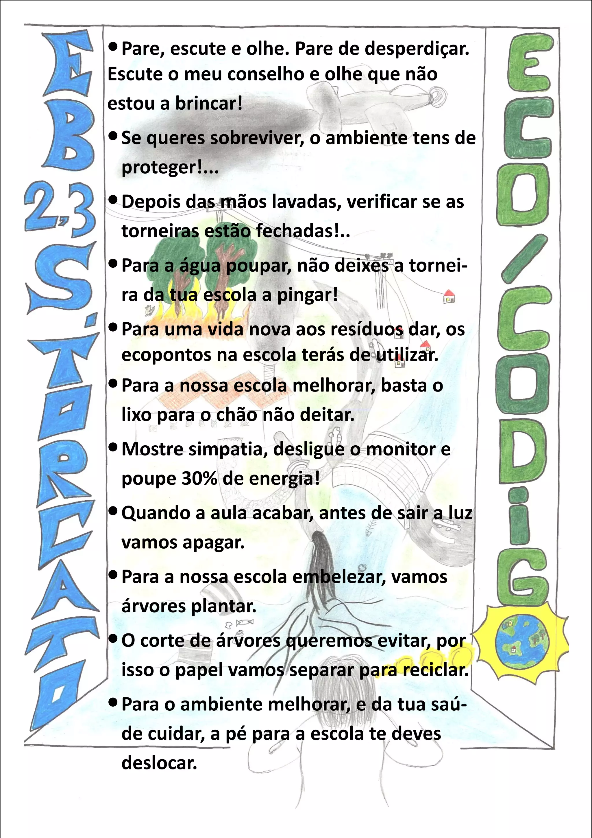 As três frases essenciais deste documento são: 1) Ele fornece conselhos para proteger o meio ambiente na escola, como poupar água, luz e papel, além de reciclar lixo corretamente. 2) Também encoraja plantar árvores na escola e andar a pé para ajudar o meio ambiente e a saúde. 3) Pede que os alunos cuidem do meio ambiente para ter uma vida sustentável no futuro.