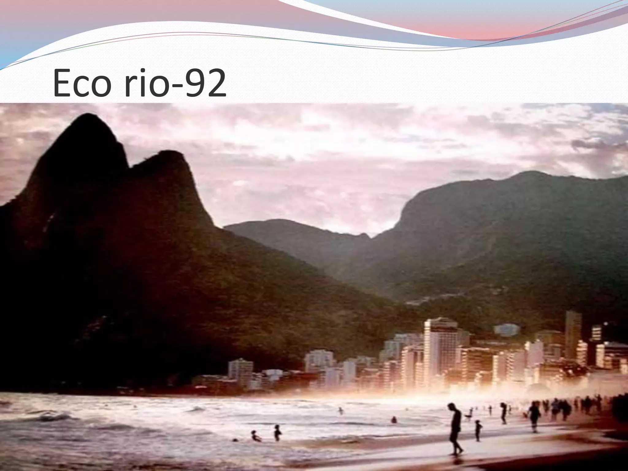 O documento descreve a Eco-92, a Conferência das Nações Unidas sobre Meio Ambiente e Desenvolvimento de 1992 no Rio de Janeiro. A conferência reuniu 176 líderes mundiais para discutir desenvolvimento sustentável e reverter a degradação ambiental. Acordos importantes incluíram convenções sobre mudança climática, biodiversidade e florestas, além da Declaração do Rio e Agenda 21, que endossaram o desenvolvimento sustentável.