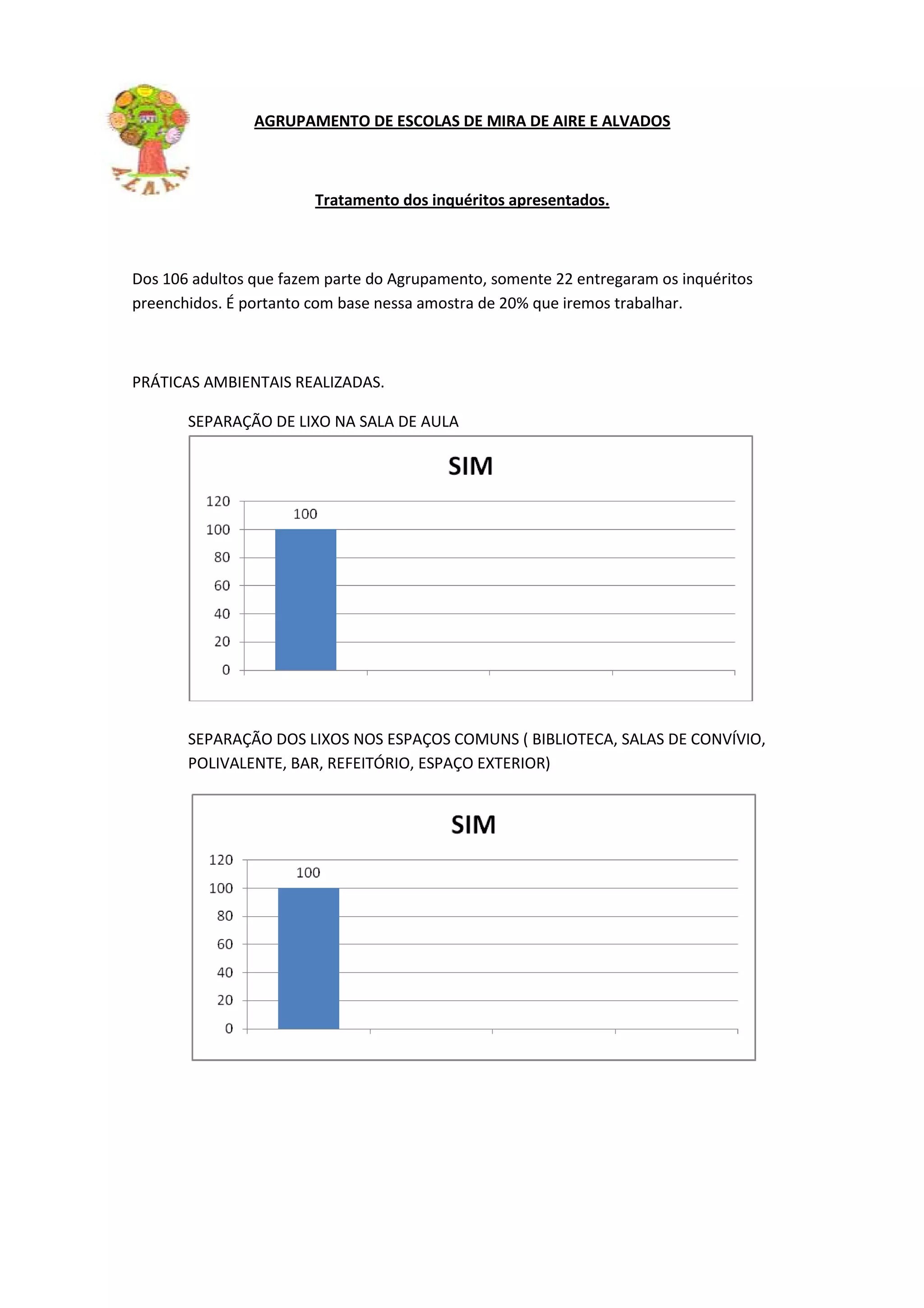 O inquérito sobre práticas ambientais no agrupamento de escolas recebeu respostas de apenas 22 dos 106 adultos. As práticas incluem separação de lixo na sala de aula e em espaços comuns, redução de gastos de água e energia, e reutilização de materiais. No entanto, ainda há desconhecimento de algumas práticas e falta de ecopontos perto das escolas. O estudo só cobriu 20% da comunidade escolar, então esforços futuros devem aumentar a amostra.