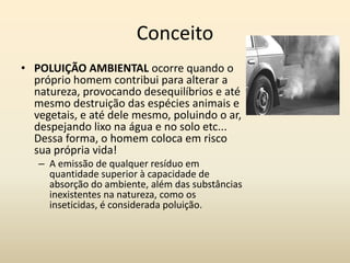 O documento discute vários tipos de poluição ambiental, incluindo inversão térmica, chuva ácida, efeito estufa, eutrofização, destruição da camada de ozônio, maré vermelha e magnificação trófica. Ele explica os conceitos, causas e impactos destes problemas ambientais, bem como possíveis soluções.