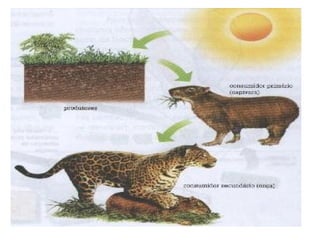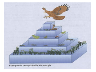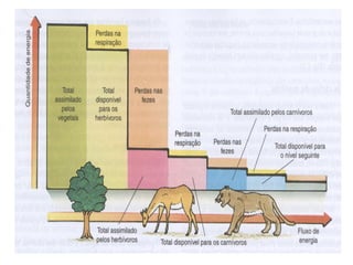 2) A energia flui através dos níveis tróficos, com apenas 10% sendo transferida de um nível para o outro.