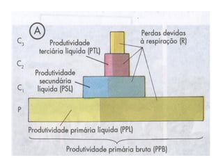3) A produtividade primária bruta mede a matéria orgânica produzida por produtores em um ecossistema.