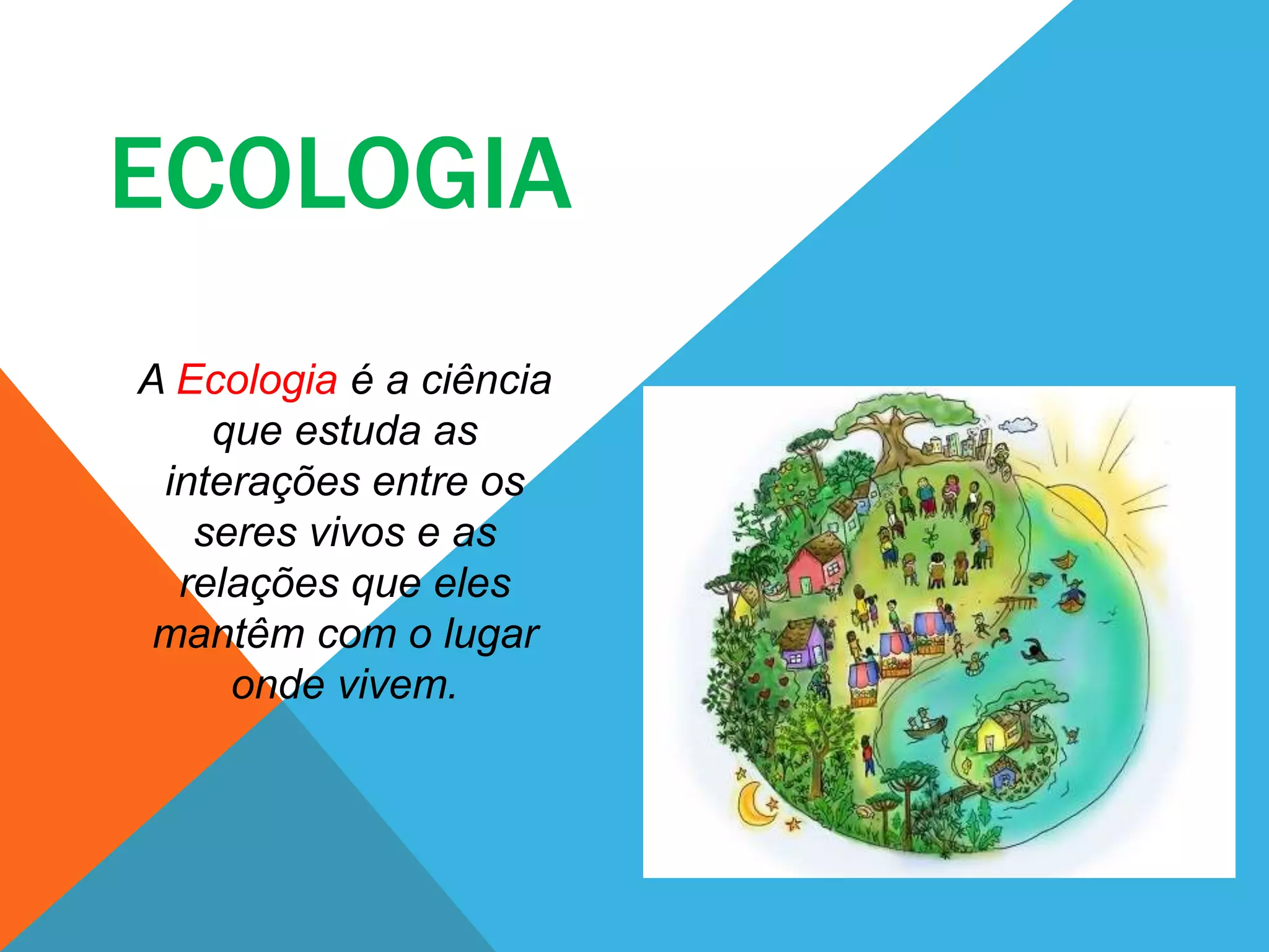 O documento apresenta conceitos básicos da Ecologia, como: (1) Ecologia é a ciência que estuda as interações entre os seres vivos e o meio onde vivem; (2) População, comunidade, ecossistema e biosfera são conceitos centrais; (3) Ecossistemas incluem componentes bióticos e abióticos.