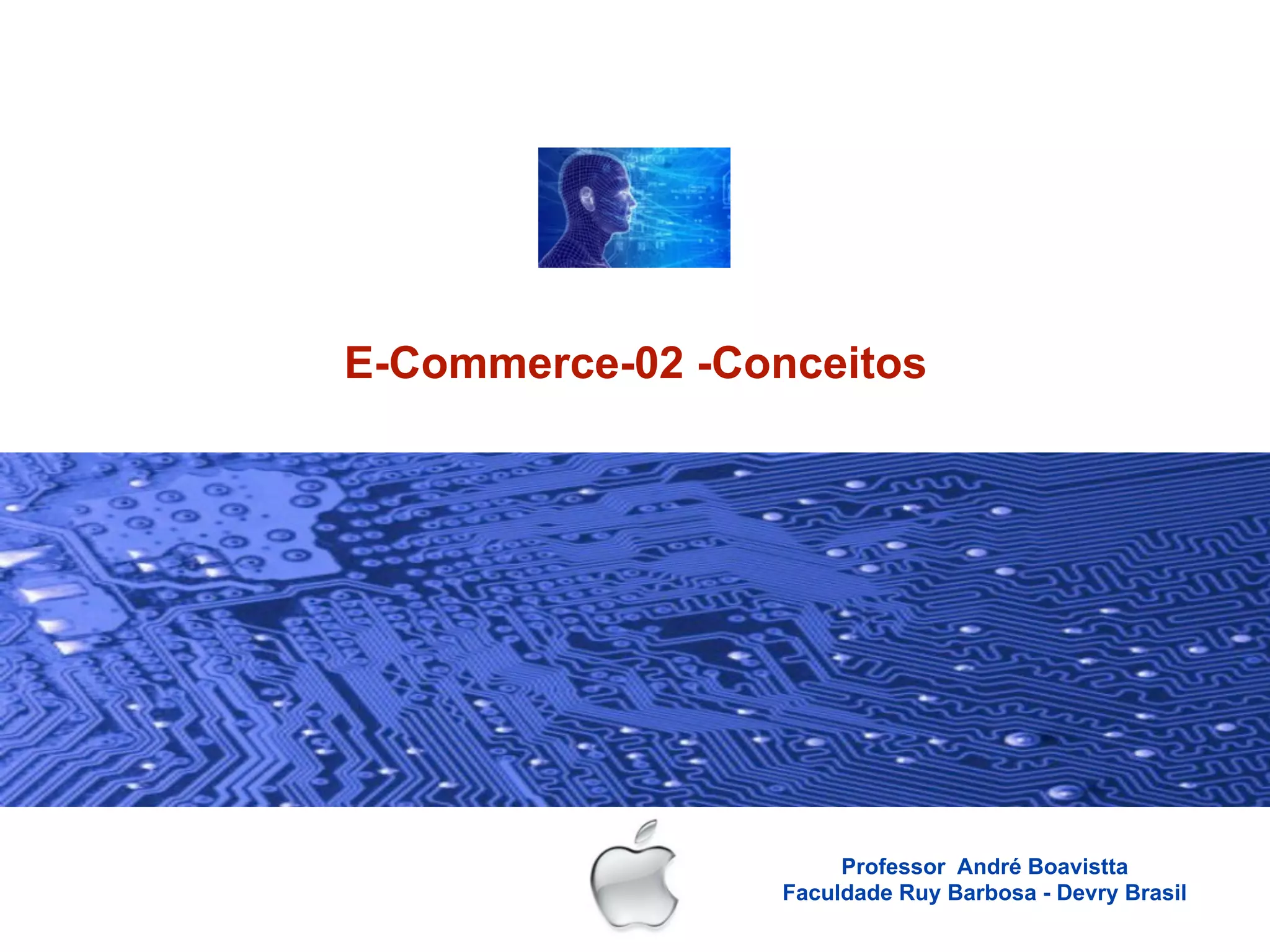 O documento discute conceitos fundamentais de e-commerce, incluindo suas definições, categorias, estrutura e aplicações. Também aborda aspectos legais relacionados a transações online.